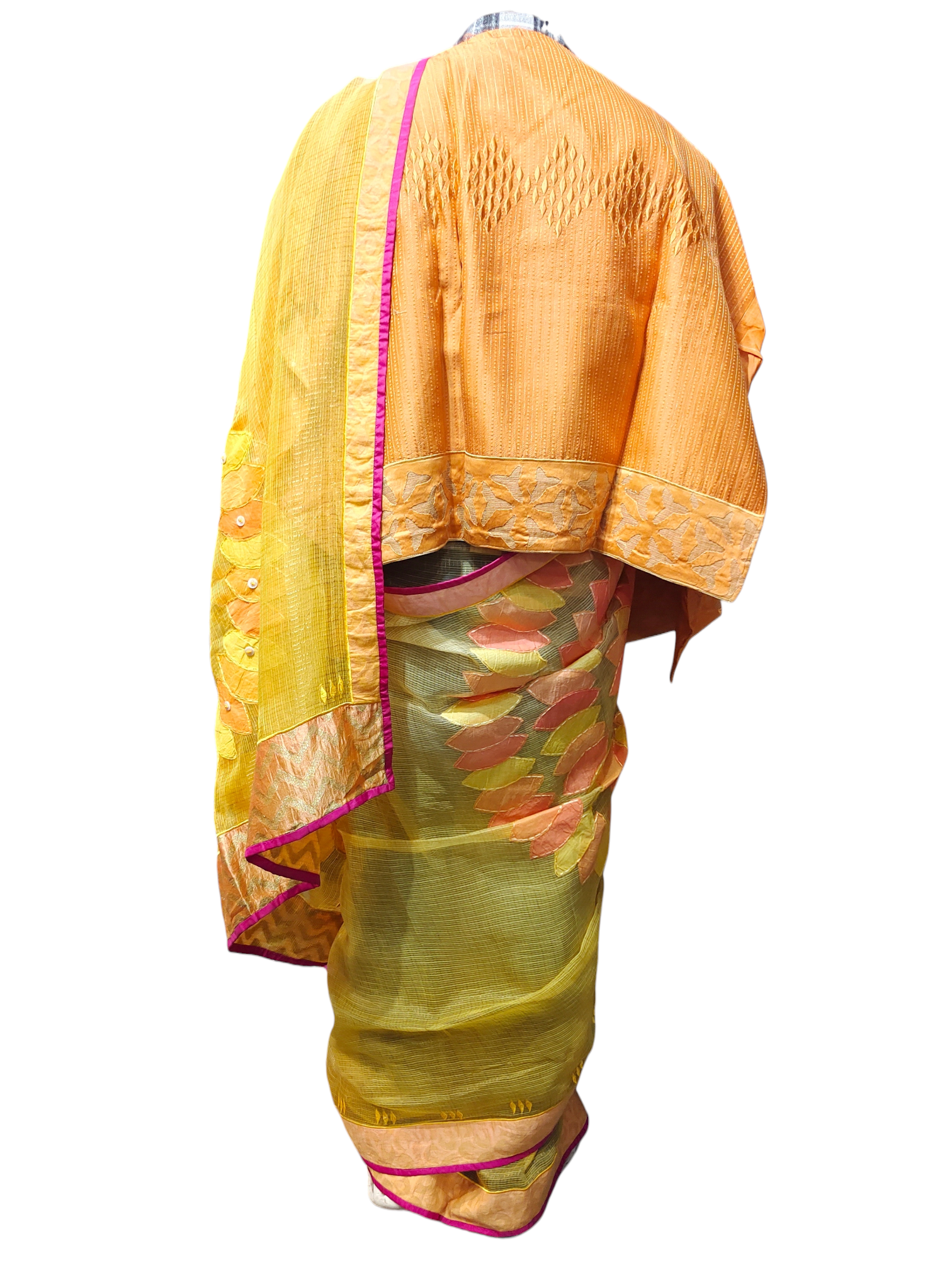 a sheer lemon yellow silk saree with pink piping and soft gold jacquard borders, detailed with translucent orange and yellow petal-shaped appliqués and subtle sequin accents, paired with a structured elbow-sleeve golden orange blouse featuring gold floral brocade cuffs, diamond motifs and pinstripe texture