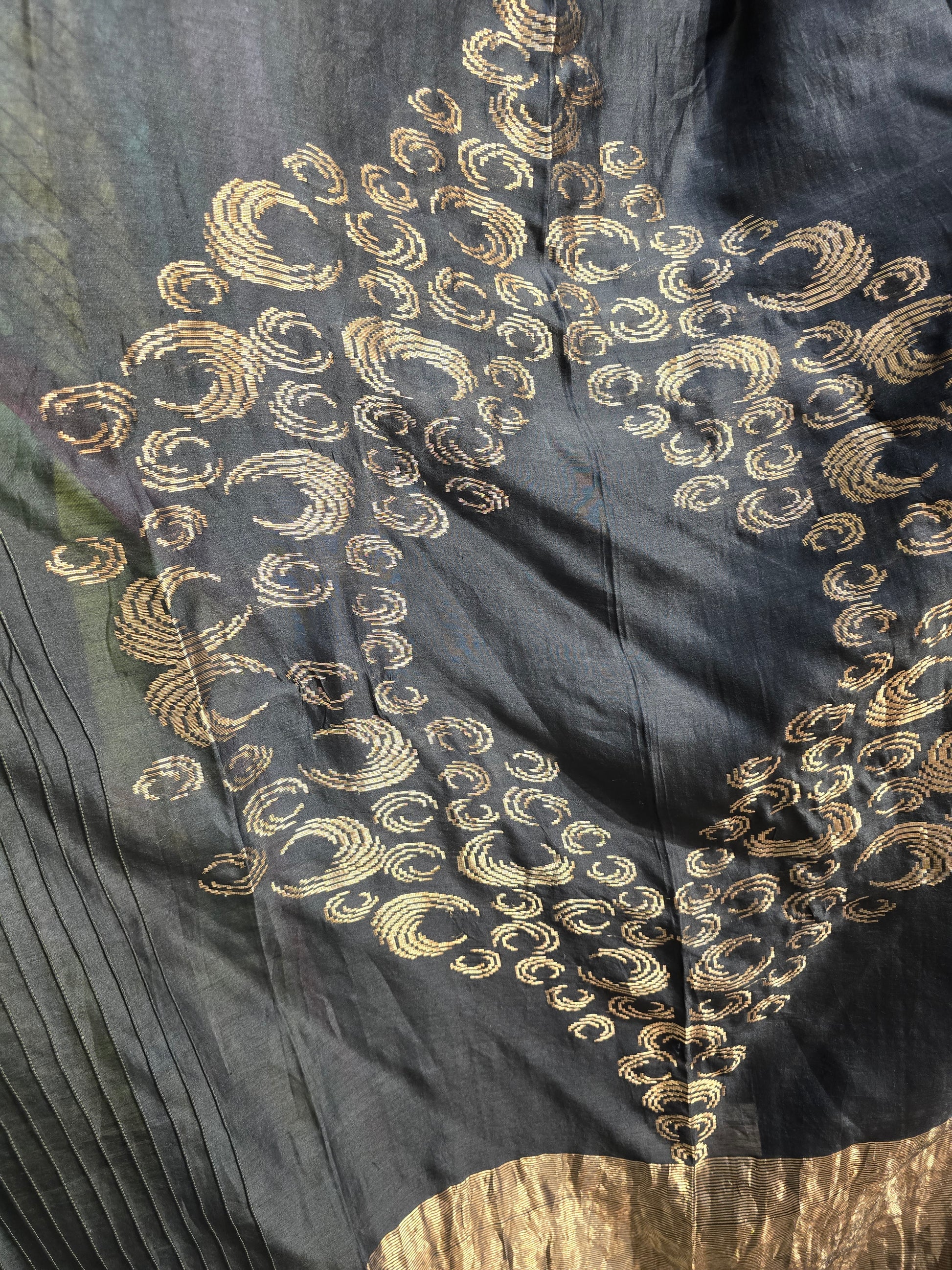 A deep black silk dupatta featuring intricate gold swirl zari weaving forming a large central motif on the pallu, fine vertical gold pinstripes along the pleats, a wide metallic gold woven border, and a subtle red accent trim, styled in a clean minimal fashion product photo, can be worn with a black raw silk kurta and matching silk pant