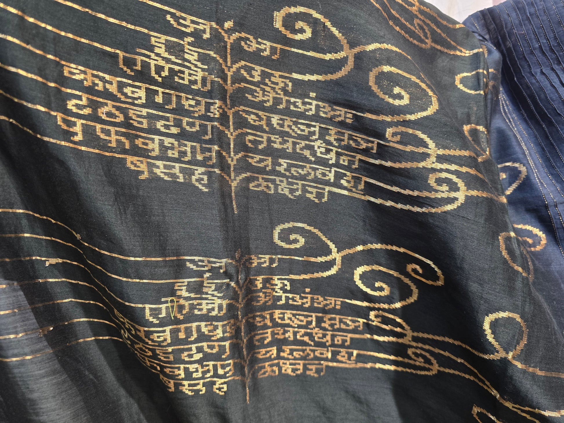 A deep green blue shaded dupatta featuring intricate gold swirl zari weaving forming a calligraphic woven motif on the pallu, fine vertical gold pinstripes along the pleats, a wide metallic gold woven border, and a subtle red accent brocade trim, styled in a clean minimal fashion product photo, can be worn with a black raw silk kurta and matching silk pant