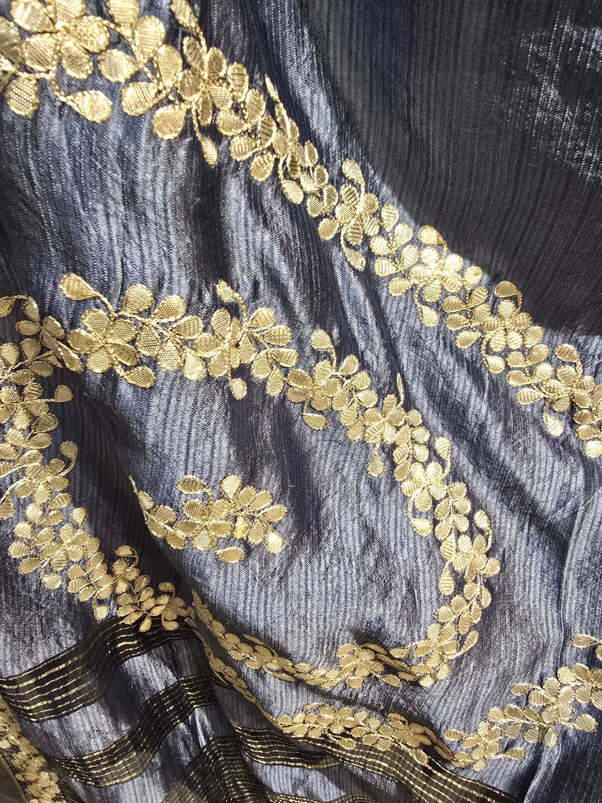 A steel blue silk dupatta featuring shimmering gold floral vine embroidery in bold swirling patterns, accented with horizontal black threadwork stripes and a fine gold-edged border, can be worn with a midnight grey navy blue raw silk kurta and matching pants