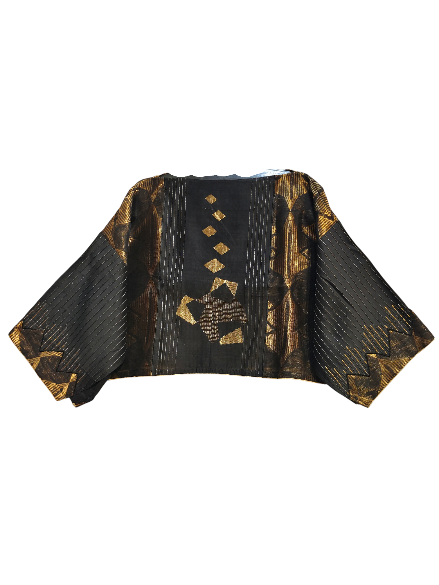 A striking silk saree in rich shades of magenta and red blending into black, embellished with gold and silver floral and geometric motifs, detailed striped borders, and tassel finishes, paired with a structured black blouse featuring wide elbow sleeves and bold golden brocade patterns, styled in the look of a traditional Indian luxury fashion editorial