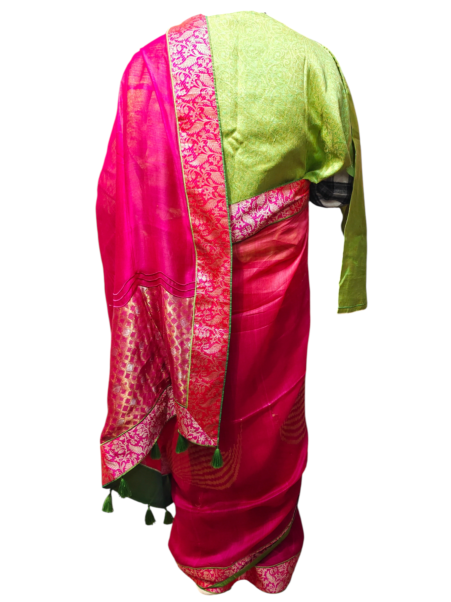 A bright fuchsia pink silk saree with rich golden brocade borders and abstract flowy wavy wings inspired zari woven motifs, paired with a vibrant lime green long-transparent sleeve blouse featuring traditional jacquard floral patterns and metallic threadwork, styled in the look of a high-end Indian couture editorial, clean minimal background, refined and regal stance.
