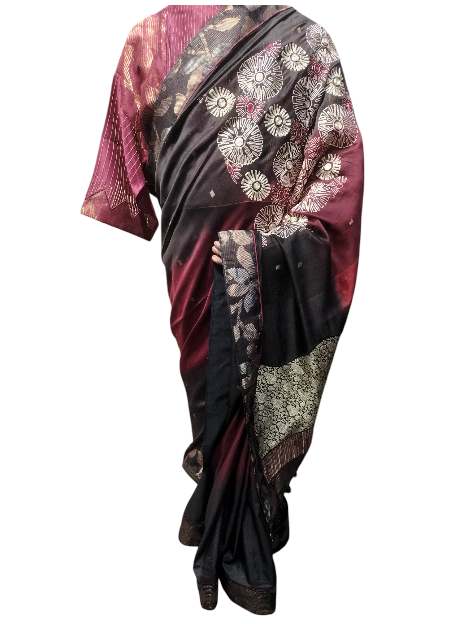 A striking silk saree in rich shades of magenta and red blending into black, embellished with gold and silver floral and geometric motifs, detailed striped borders with floral dhakai organza overlay, and tassel finishes, paired with a structured black blouse featuring wide elbow sleeves and bold golden brocade patterns, styled in the look of a traditional Indian luxury fashion editorial