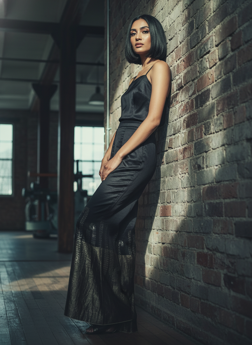 These extraordinary chanderi high-waisted black flared silk bootcut palazzos with metallic gold woven jacquard detailing on the lower half, featuring subtle botanical motifs and a fluid wide-leg silhouette.