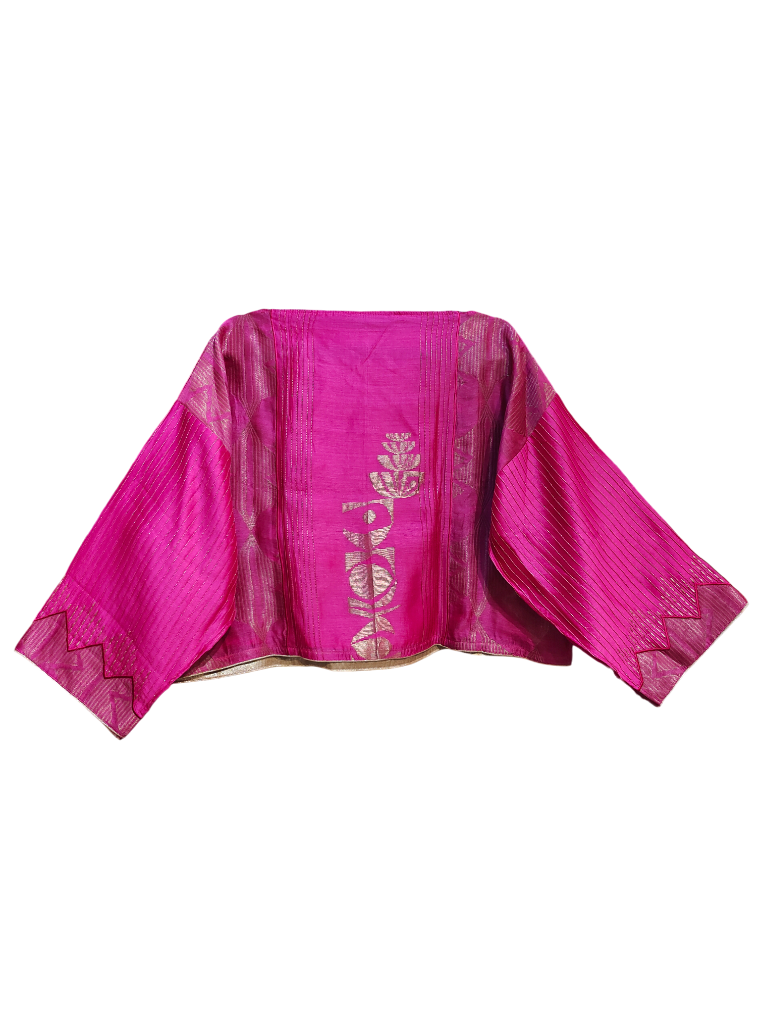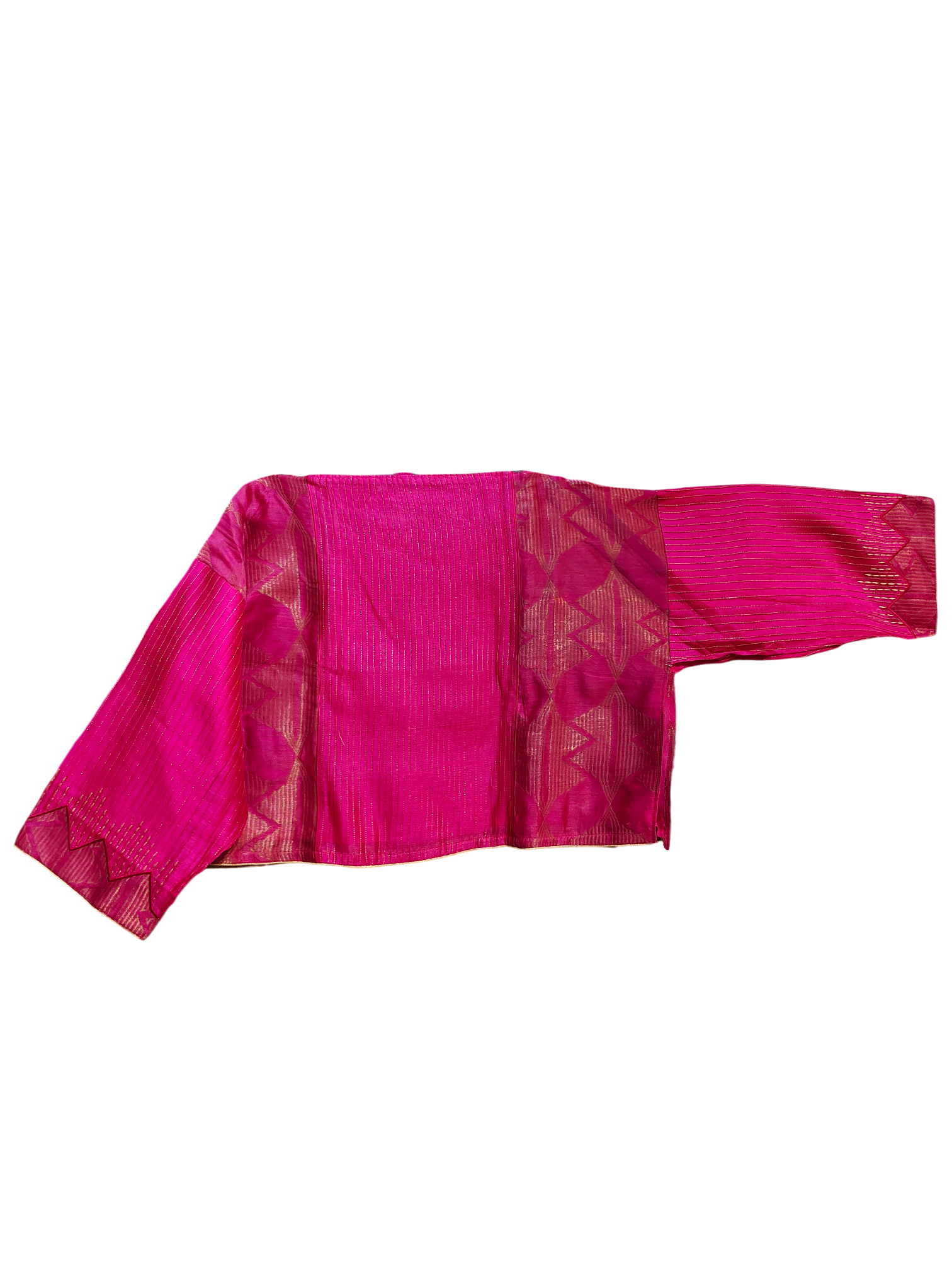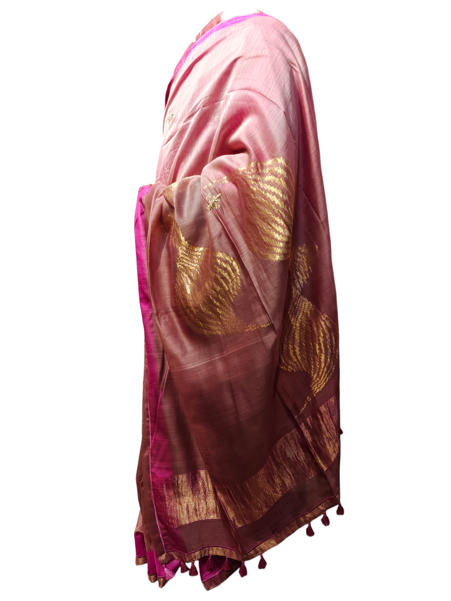 A model wearing a soft pink silk saree with golden zari woven motifs and a contrasting bright magenta pallu adorned with gold embroidery and tassels, paired with a magenta blouse featuring gold accents and subtle geometric patterns.