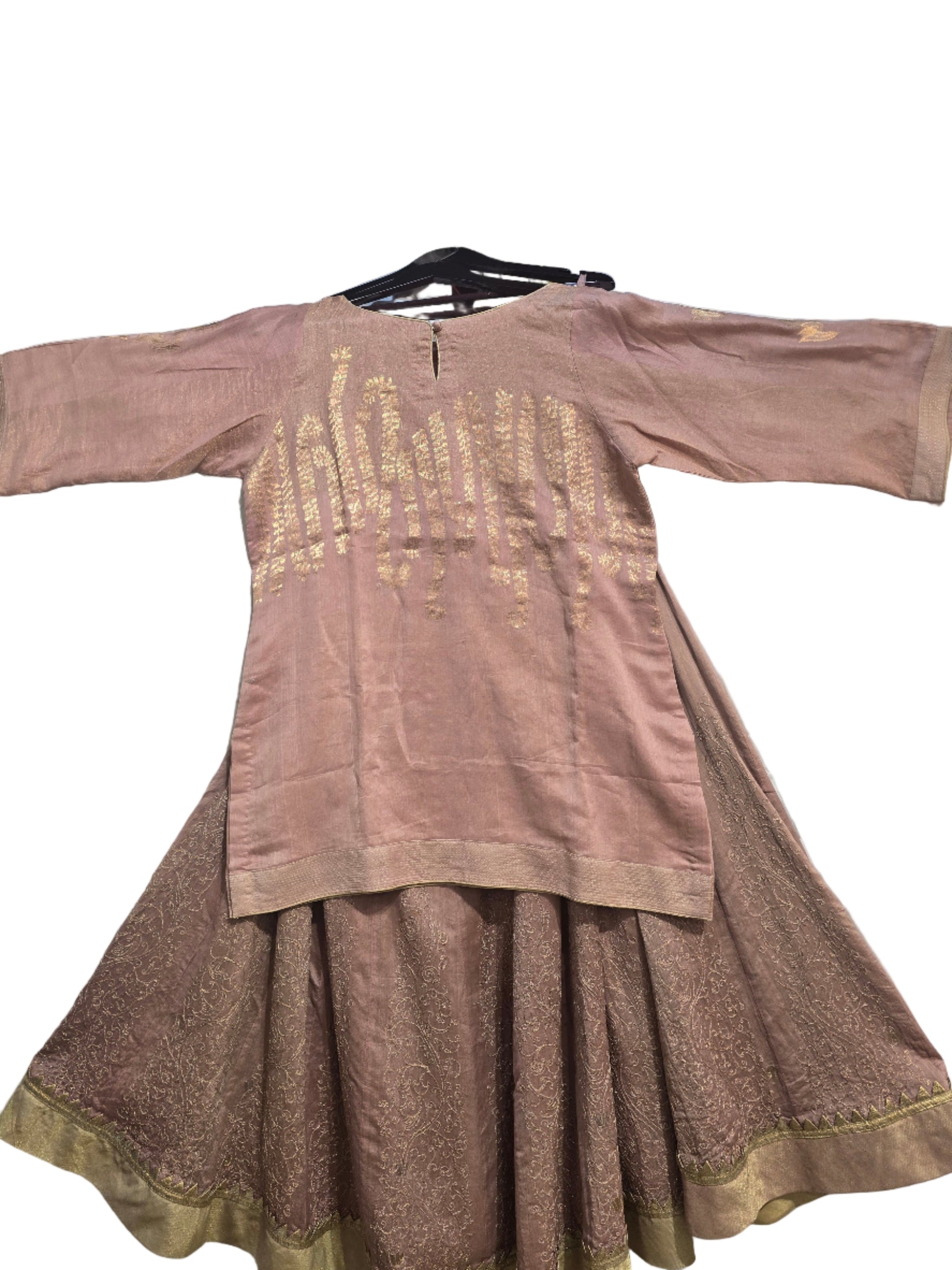 A muted rose pink two-piece ethnic ensemble featuring a quarter length sleeve straight-cut kurti with golden thread embroidery across the chest, paired with a flared full-length skirt with intricate gold floral embroidery and a wide gold zari border, clean minimal fashion product photo, in the style of a Raw Mango fashion editorial teamed up with a rose gold tissue stole with tassel trims along the edge