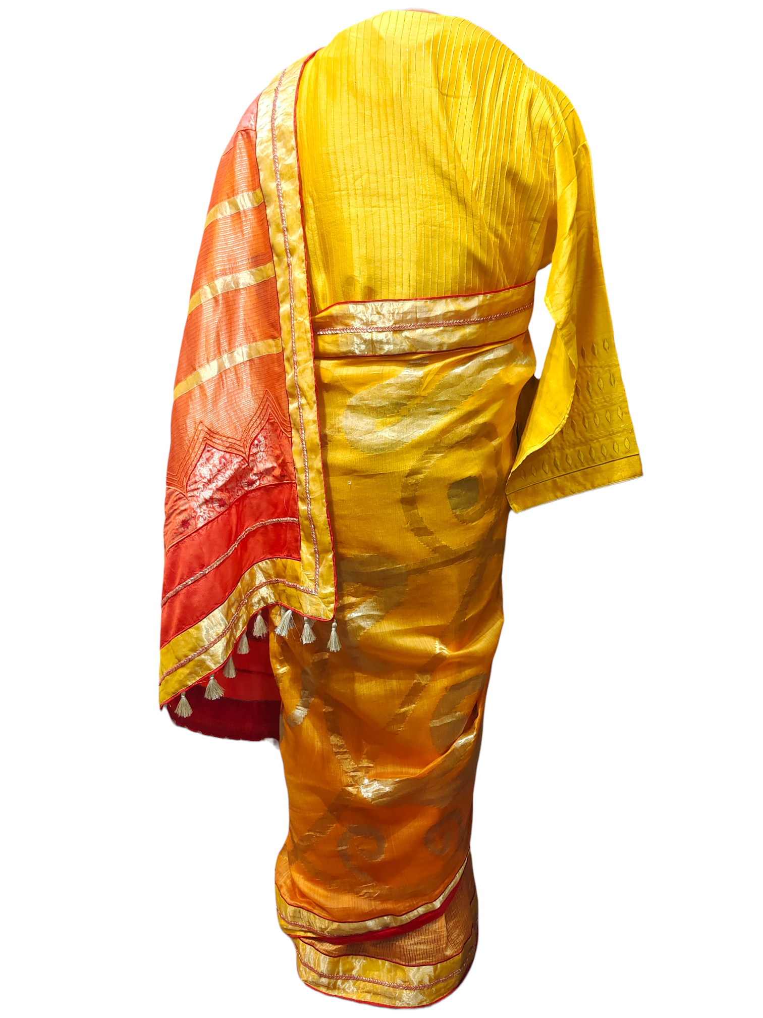 Full-body, edited professional shot of a model wearing a traditional bright yellow silk saree with glossy gold woven patterns and a striking orange-red pallu featuring intricate zari work, golden stripes, and scalloped brocade detailing, paired with a matching orange or yellow blouse adorned with gold embroidered sleeves and back fern style motif and the front side with pinstripe texture, styled in the look of a high-end Indian wedding fashion editorial, clean white background, elegant timeless pose.