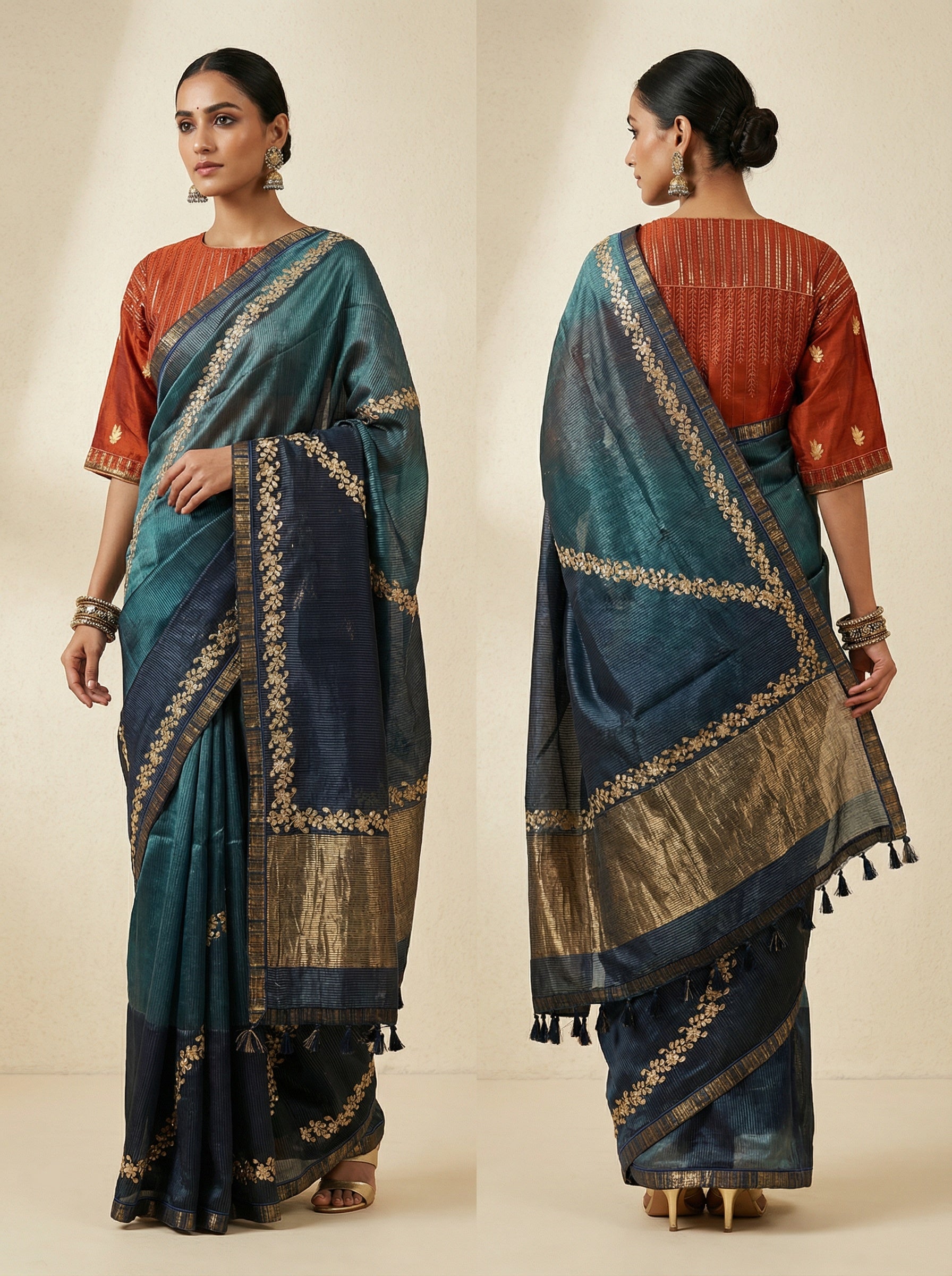 A full-length deep teal and navy silk saree with fine gold thread embroidery in floral garland motifs, metallic zari pallu, and striped woven border, paired with a burnt orange elbow-sleeve blouse featuring metallic vertical pinstripes, embroidered vines, and gold floral butis on the sleeves