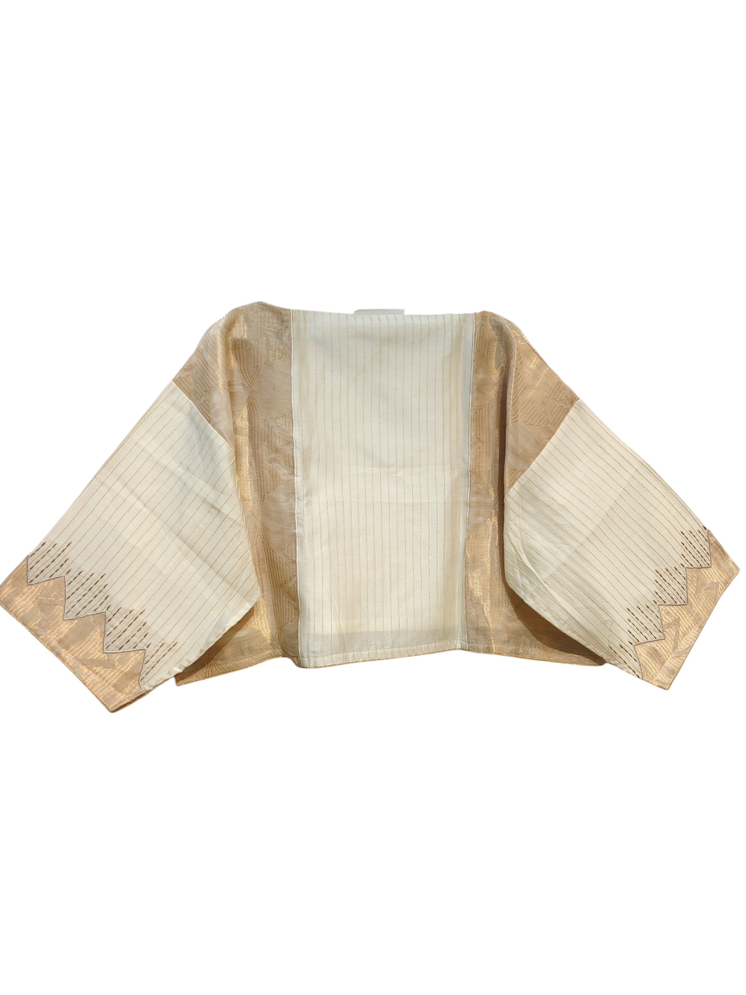 A full-length ivory and beige silk saree with intricate self-embroidered leaf motifs, sheer pallu with horizontal gold stripes, and subtle tassel detailing, paired with a structured elbow-sleeve blouse in ivory with linear gold embroidery, geometric woven panels, and metallic zigzag sleeve trim