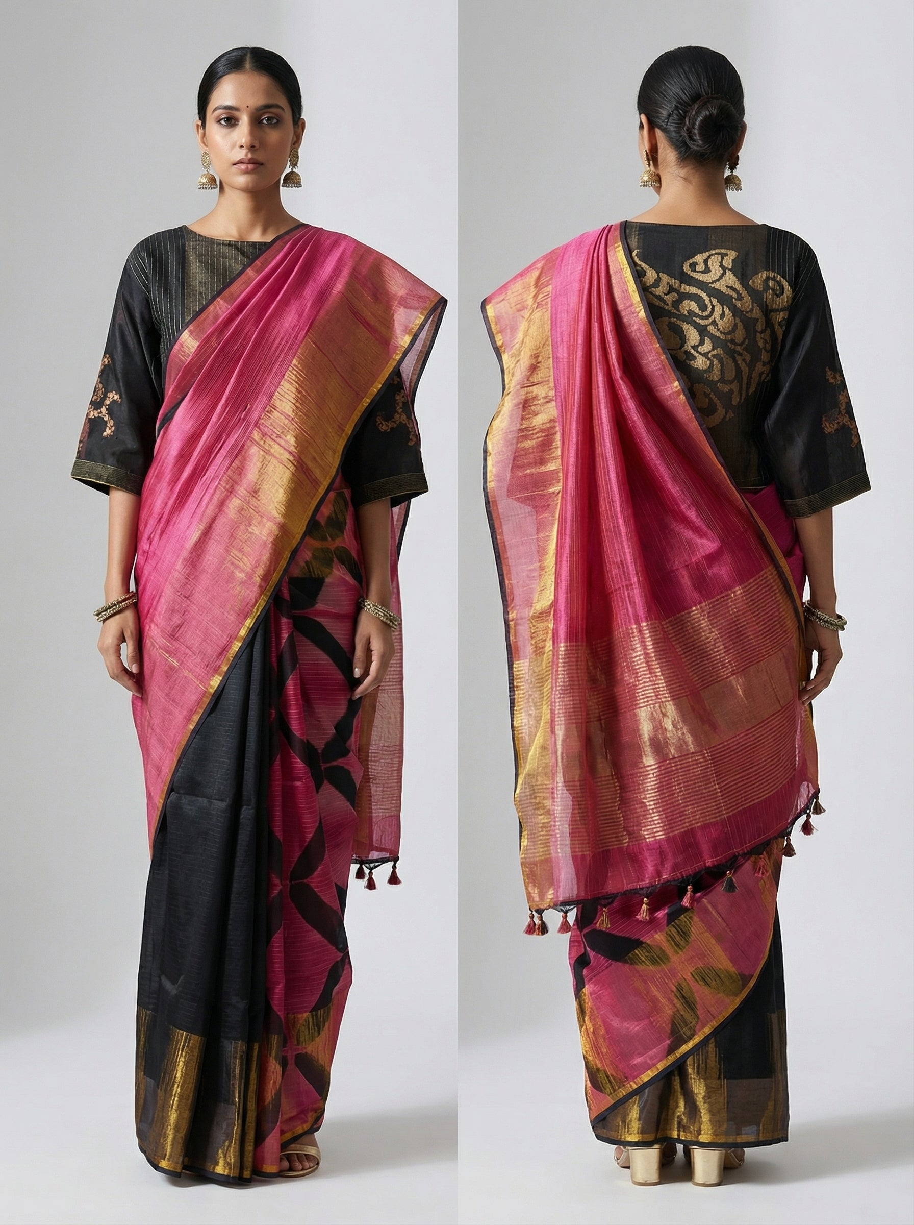 A full-length black and fuchsia pink silk saree with hand-painted abstract floral patterns, golden brushstroke accents, and a sheer pink-gold striped pallu with tassel trim, paired with a black elbow-sleeve blouse featuring metallic gold brocade vine motif on the back, striped panel detailing, and floral embroidery on the sleeves