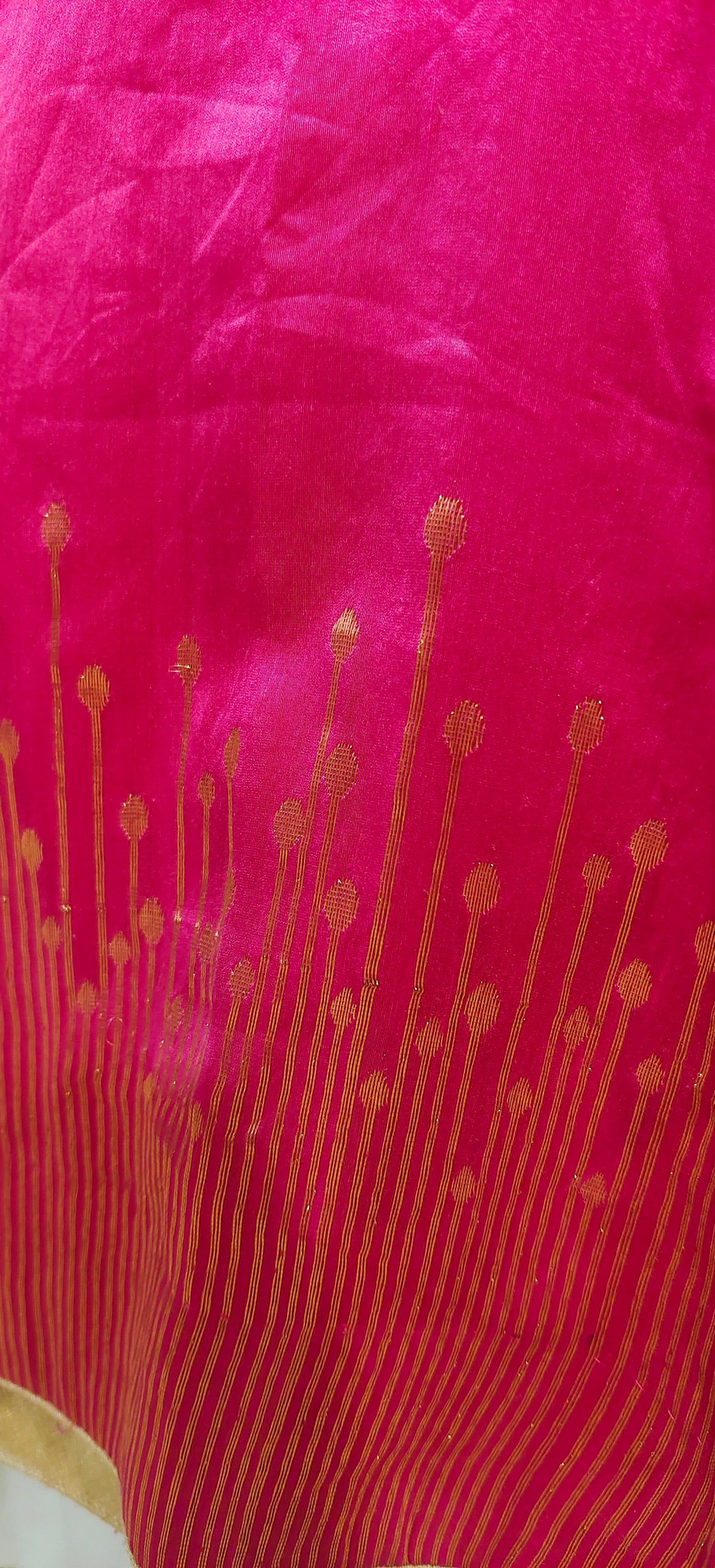 A sleeveless V-neck jumpsuit in deep fuchsia silk with a fitted bodice, fine gold linear embroidery radiating across the chest, defined waist seam, and wide-leg silhouette falling to ankle length with subtle gold motif detailing near the hem, paired with a long, open-front cream silk brocade jacket featuring a relaxed straight cut to mid-thigh, three-quarter sleeves, soft gold geometric woven pattern, contrasting hot-pink satin lapel trim, and structured yet fluid drape, elegant Indo-heritage luxury styling