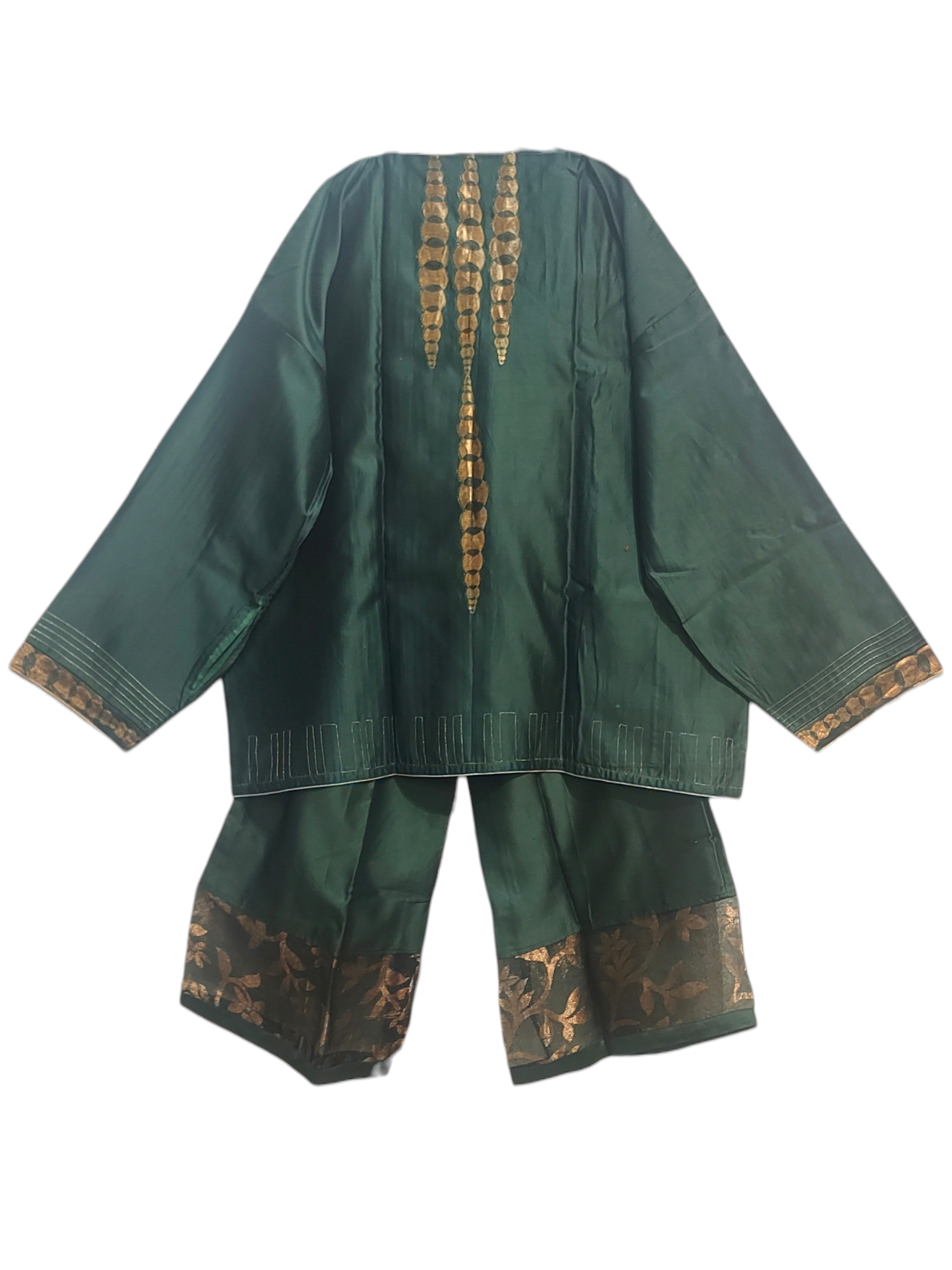 A statement tunic set with plazzo in rich forest green silk chanderi with gold metallic thread detailing, and a matching chanderi plazzo pants edged with gold dhakai hem giving an edgy designer look