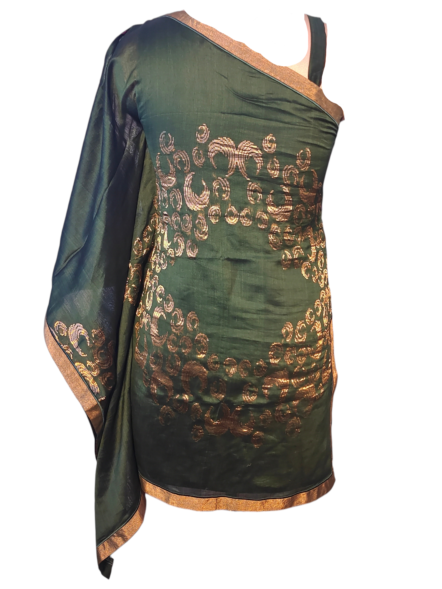 A deep forest green two-piece chanderi silk set featuring a one-shoulder asymmetric waist length kurta with rich gold zari embroidery in traditional swirling motifs, and wide-leg trousers finished with ornate gold floral brocade at the hem, styled for a regal ethnic look, clean minimal backdrop, in the style of a high-end South Asian festive fashion editorial.