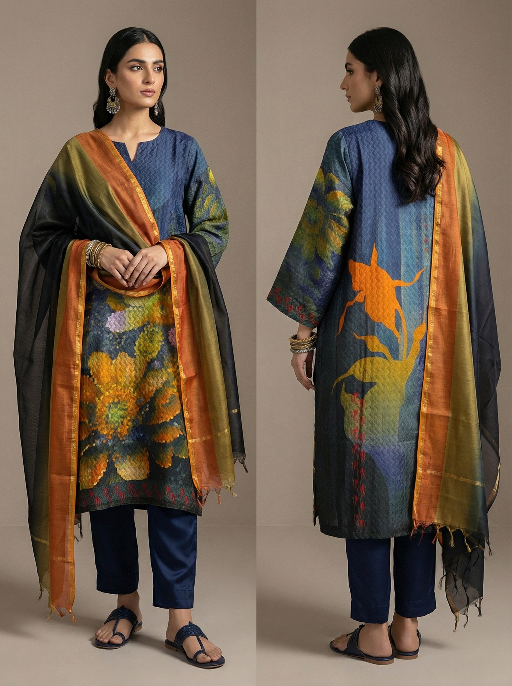 This 3 pc suitset features wearing a mid calf-length textured silk kurta in deep navy with a zigzag weave, featuring painterly floral prints in vivid yellows, greens, and oranges on the front side, and subtle red embroidered accents at the hem and sleeves, styled with a sheer tricolor dupatta in black, olive, and burnt orange silk with gold trim