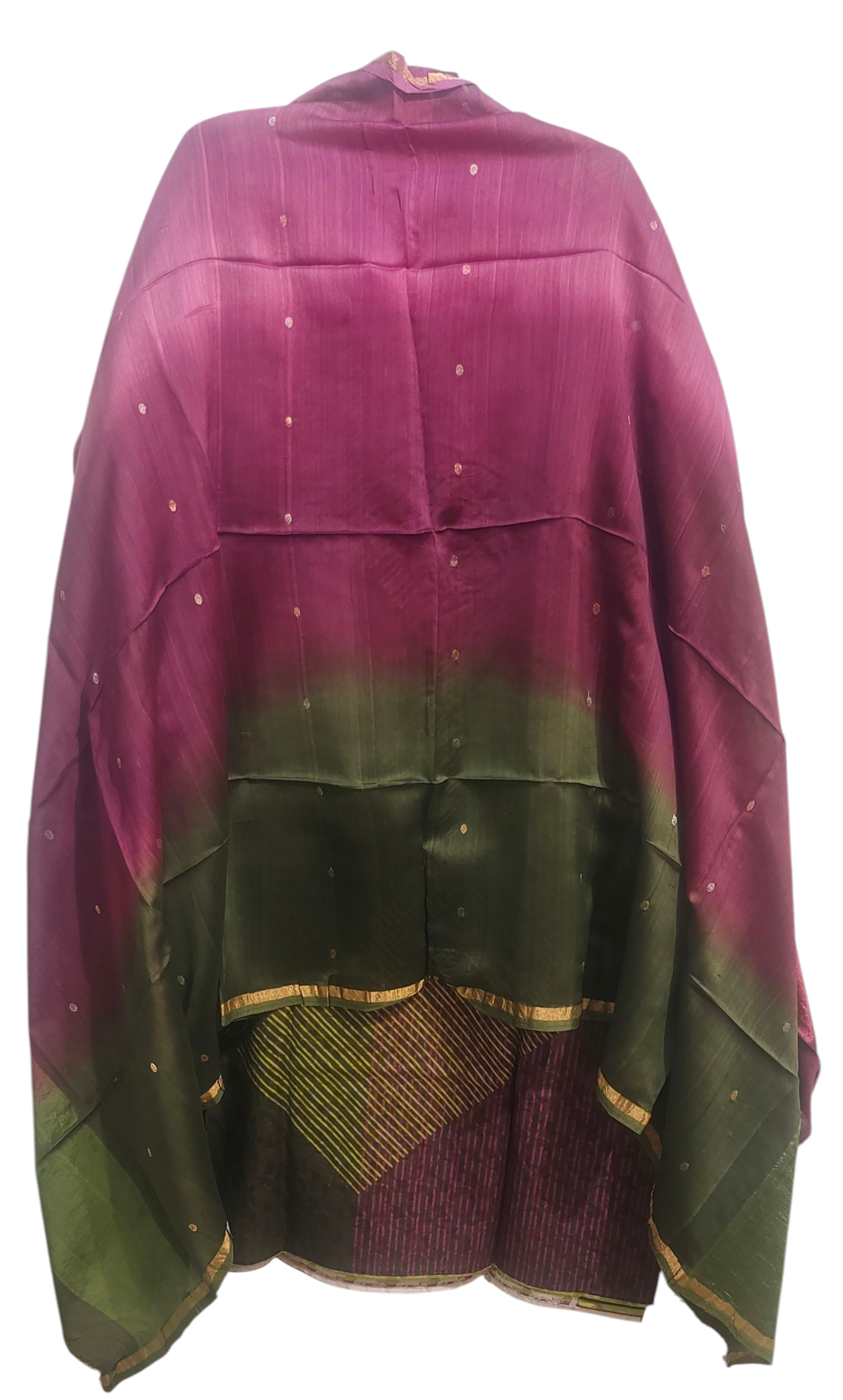 This 3 pc suitset features a knee-length structured silk cotton chanderi jacquard self design kurta in a deep plum and olive gradient with geometric striped accents in yellow and magenta, paired with a matching dupatta featuring gold thread detailing and a magenta border, rich jacquard texture throughout, clean minimal fashion product photo, urban ethnic luxe, fashion-forward pose in the style of an Elle India editorial.worn with matching solid colour satin trouser pants, silver oxidised jewellery in earrings and bangles, golden matching heel sandles