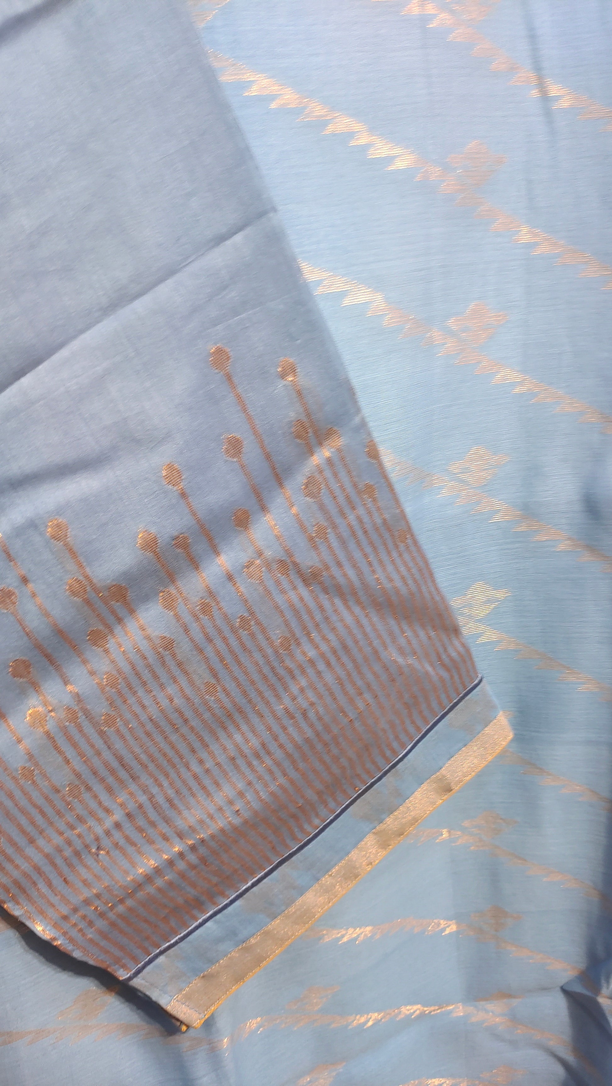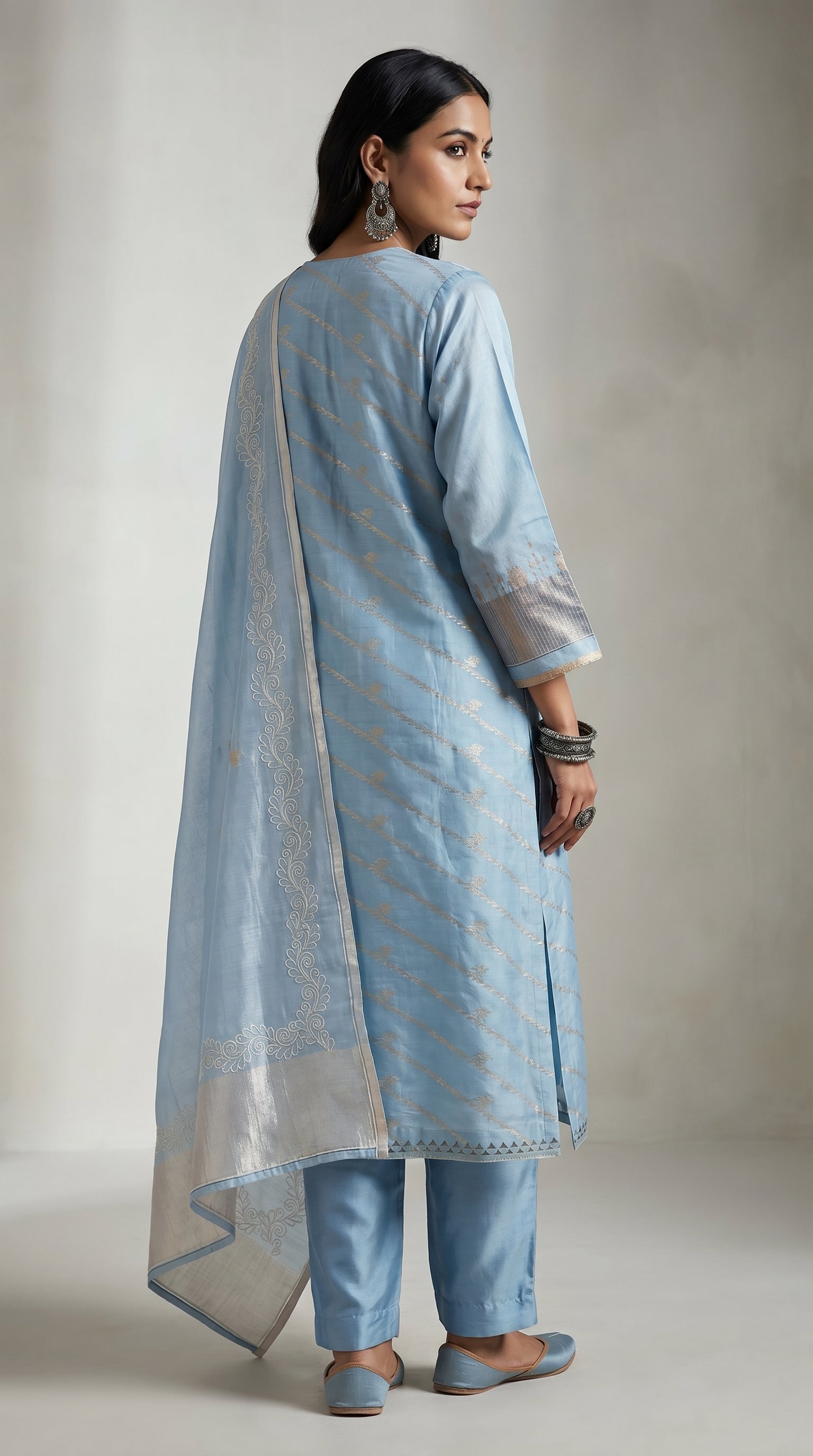 A serene expression in Neel Sky tones, this Chanderi kurta set captures fluid movement through its diagonal zari leher pattern that gently traverses the surface. The silhouette remains clean and elongated, enhanced by subtle sheen and a finely detailed hem. Delicate zari buta accents add quiet highlights across the body. It is paired with a silk Chanderi dupatta framed with an intricate resham-inspired border, softened by tonal gradients and finished with a luminous woven edge—bringing balance to the airy composition. Coordinated bottom fabric completes this refined ensemble.