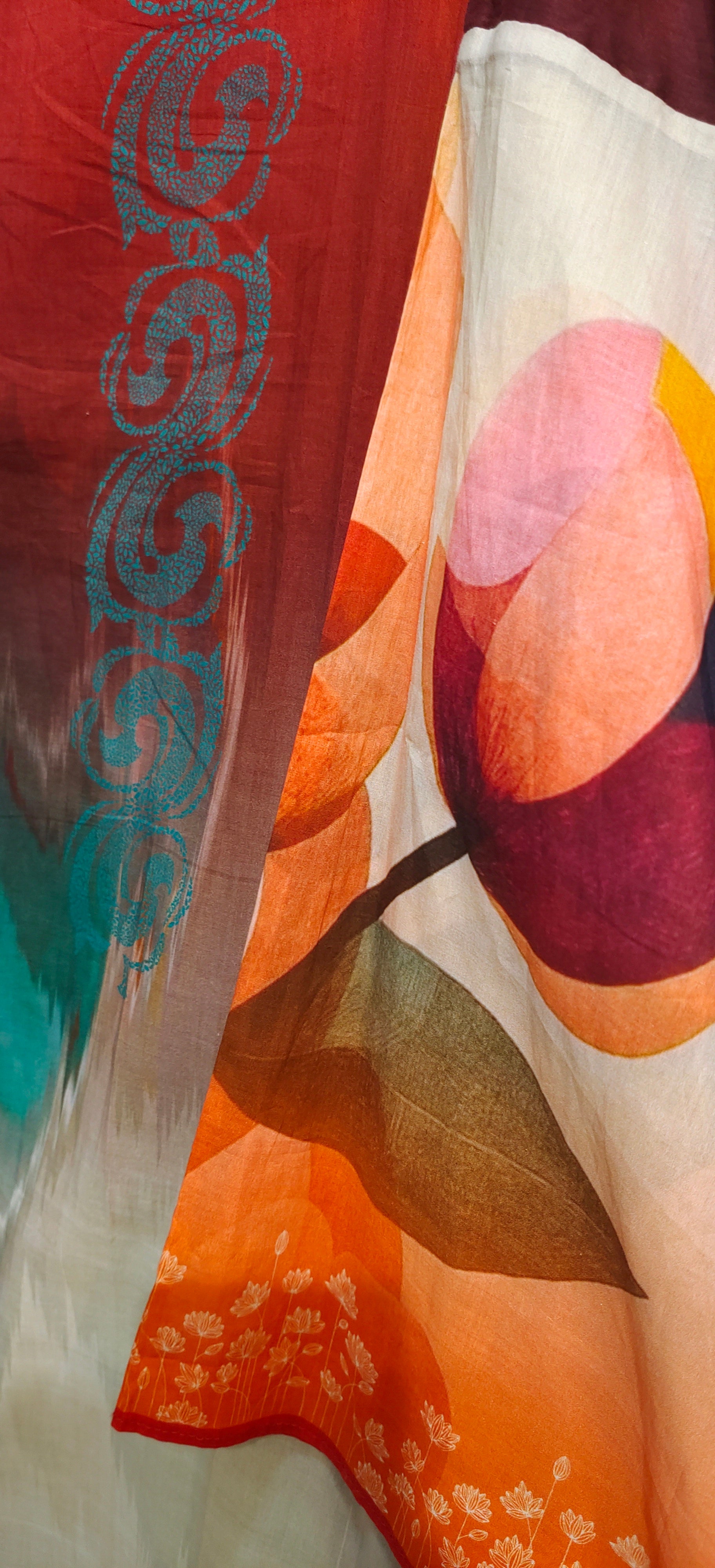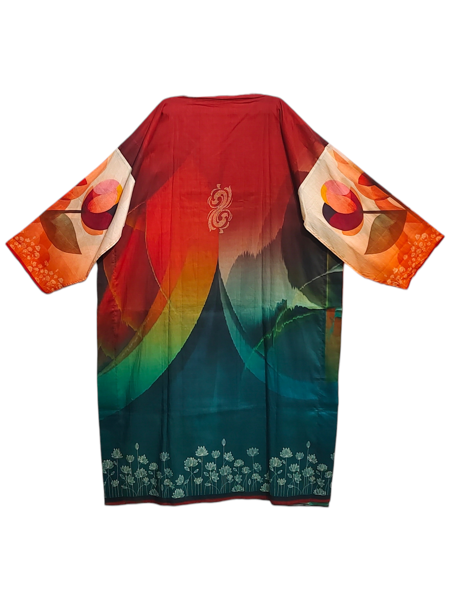 This 3 pc suitset features cotton lawn kurta in gradient hues of crimson, beige, teal, and tangerine, featuring abstract painterly washes and floral embroidery at the hem, styled with a multicolor dupatta in deep teal, maroon, and ivory with gold trim and soft floral detailing on the sleeves, clean minimal fashion product photo, expressive and bold ethnic fusion in the style of Satya Paul fashion editorial.
