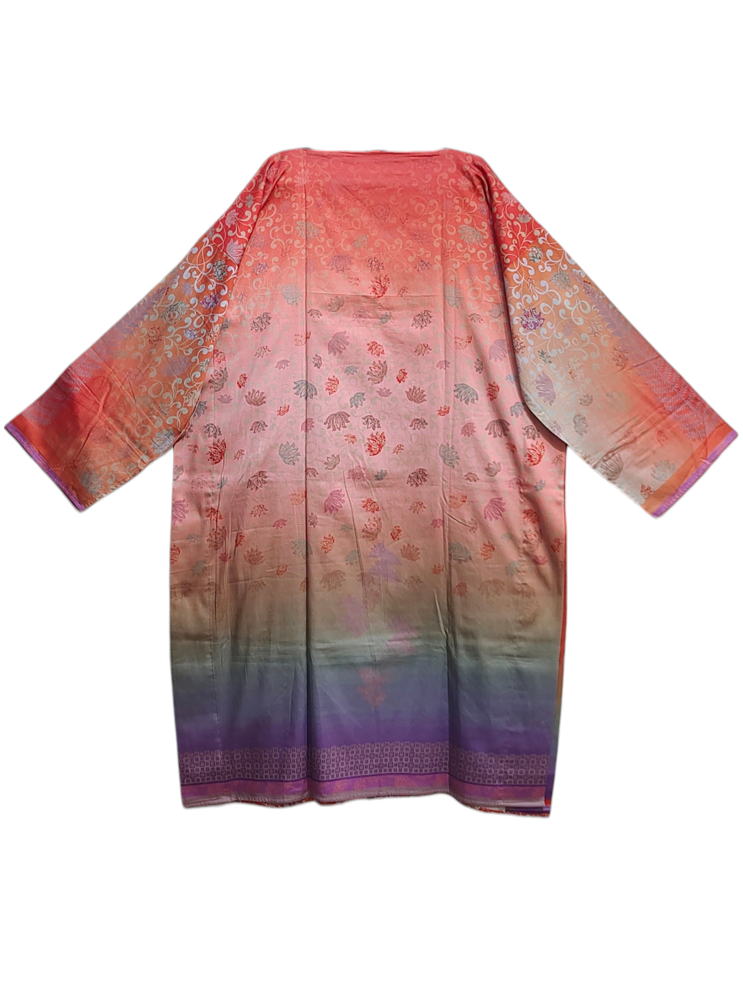 This 3 pc suitset features a mid calf-length silk kurta in ombré shades of coral, blush, and lavender with delicate metallic floral motifs and ornate scrollwork on the sleeves, styled with a sheer dupatta in vivid red and purple gradient featuring embroidered botanical borders and geometric accents