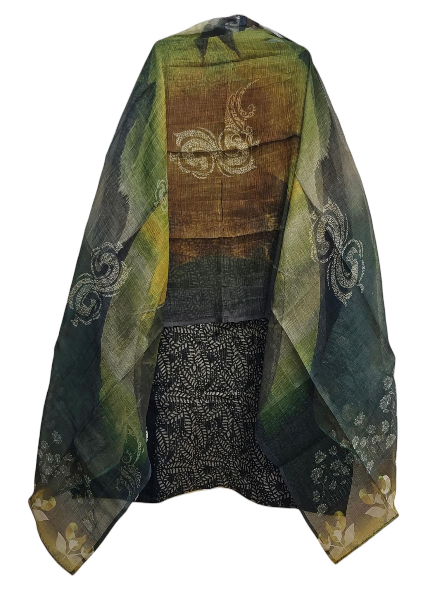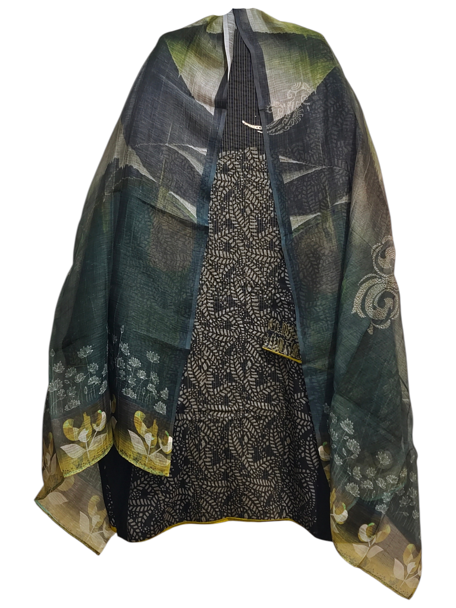 It is paired with a digital printed silk linen kota dupatta. The dupatta measures 2.5 meters in length and 38 inches in width.the ensemble is provided with a matching cotton satin bottom material for 2.5 mts.Kurta will need lining for tailoring