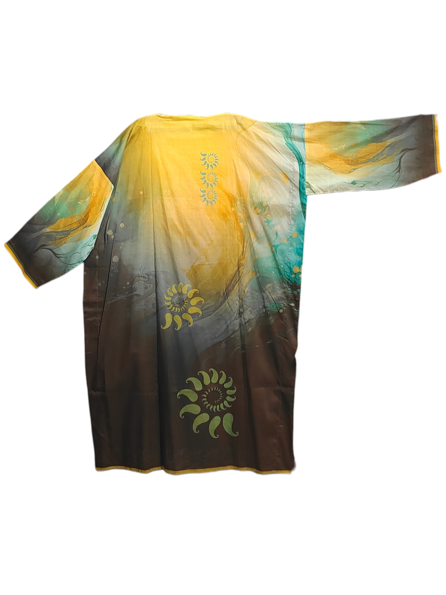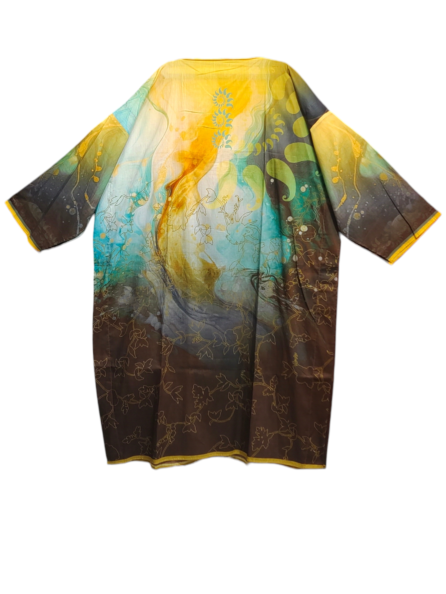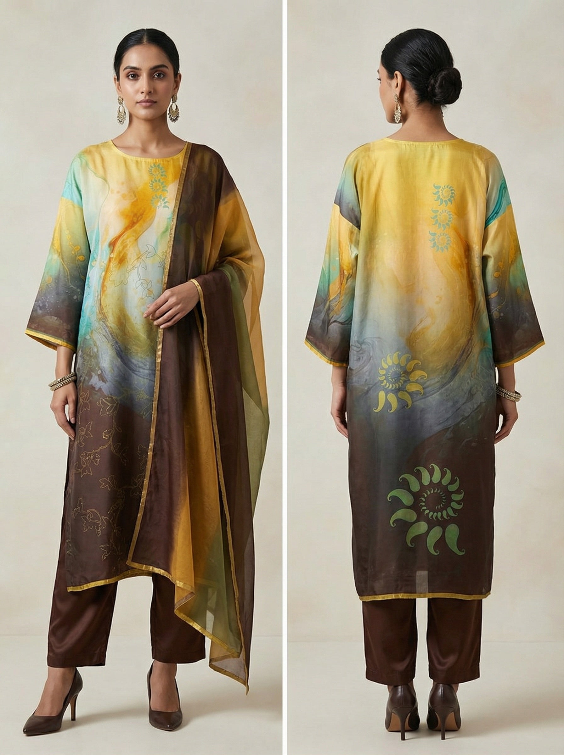 This 3 pc suitset features a mid calf-length silk kurta in gradient tones of yellow, aqua, and deep brown, featuring swirling abstract patterns and delicate floral outlines, accented with spiral sun motifs in turquoise and green, styled with a sheer tricolor dupatta in chocolate brown, ochre, and olive with gold edging