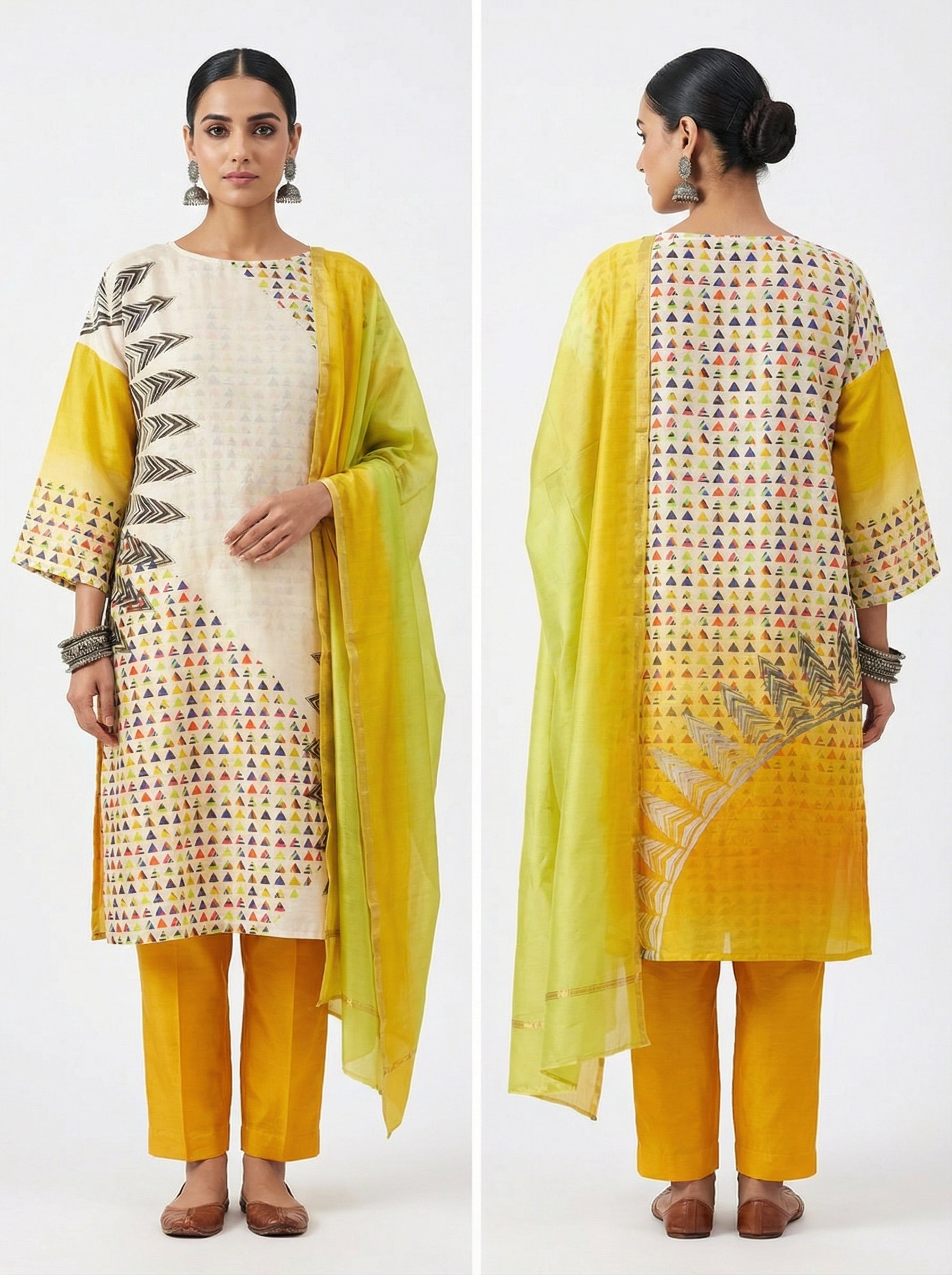 Cotton lawn kurta set featuring bold triangular multicolor prints arranged in geometric repetition across a cream base and ombre yellow shading on the back panel lower area with upper area filled with multicolour triangular prints. Accented with striking black zigzag motifs and gradient yellow sleeves, the ensemble is paired with a dual-tone lemon-lime silk dupatta. The design combines modern tribal graphics with playful symmetry and color blocking.