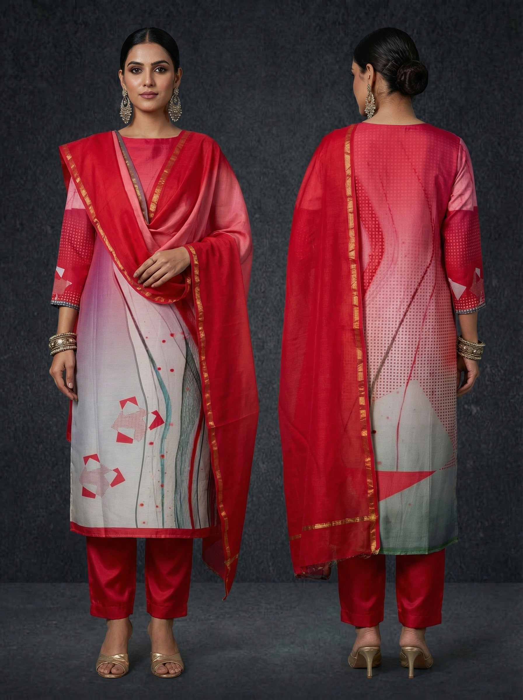 It is paired with a shaded Chanderi dupatta. The dupatta measures 2.5 meters in length and 38 inches in width.the ensemble is provided with a matching cotton satin bottom material for 2.5 mts.Kurta will need lining for tailoring