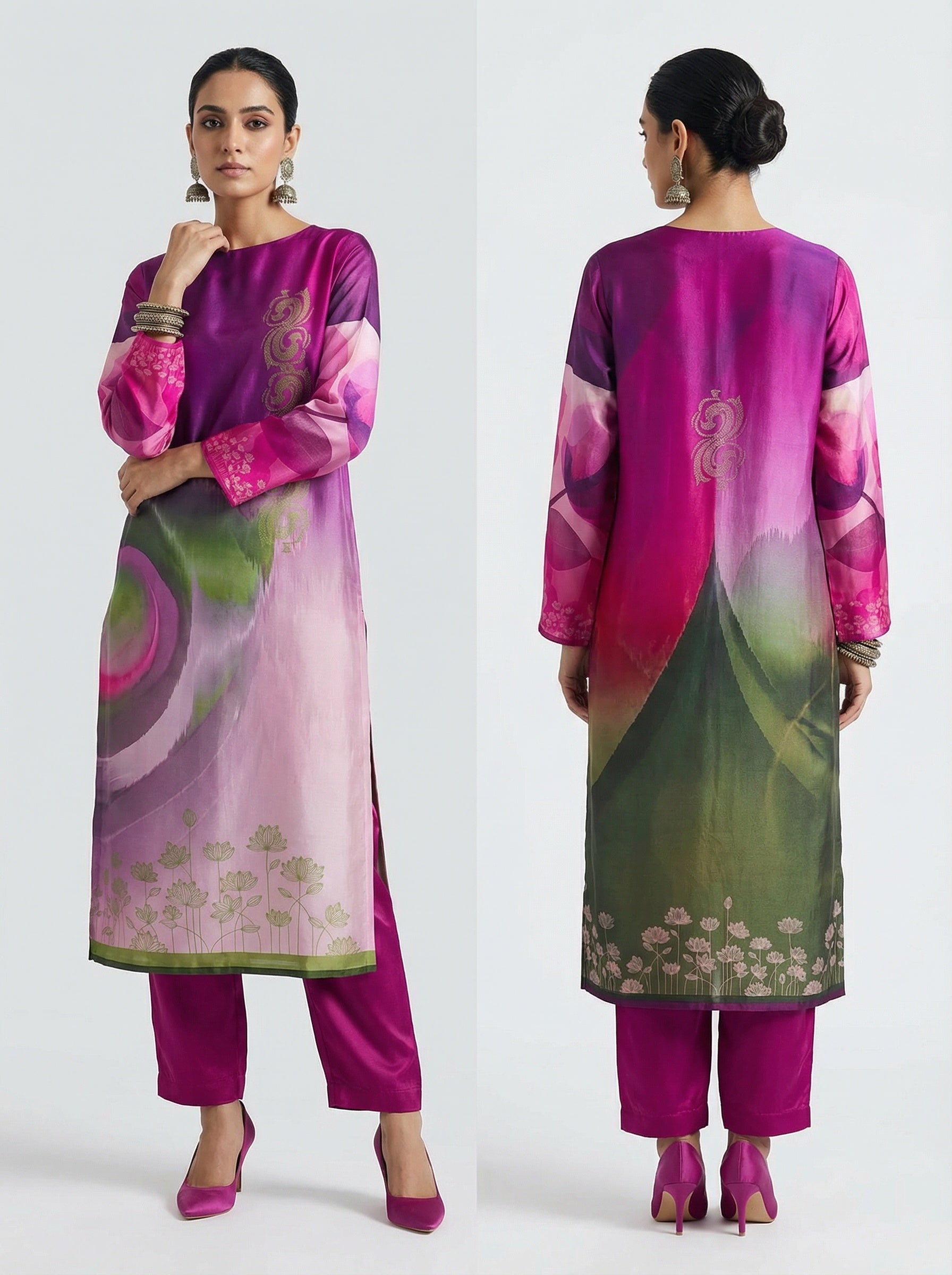 The kurta is designed in contemporary abstract prints in modern themes printed on premium cotton lawn fabric giving a very luxurious feel and handle to the kurta.This kurta is 48 inch maximum in length but can be shortened as per requirement as there is no neckline .The single side ghera is 34 inch so sizes upto 5XL are possible to get tailored in this material.
