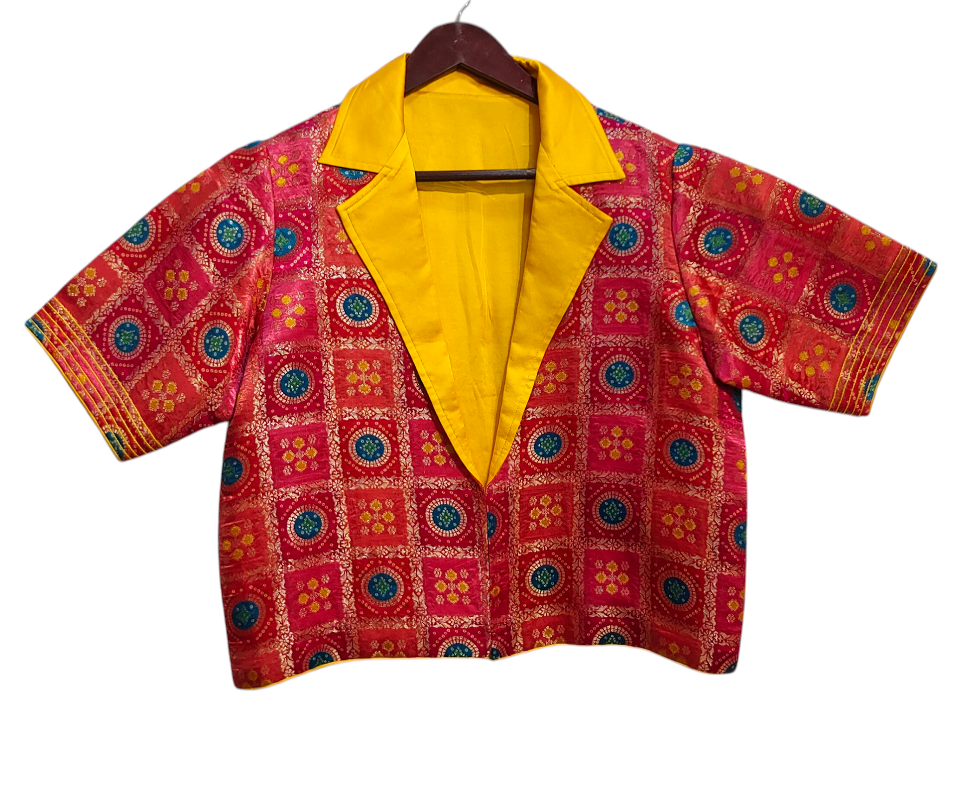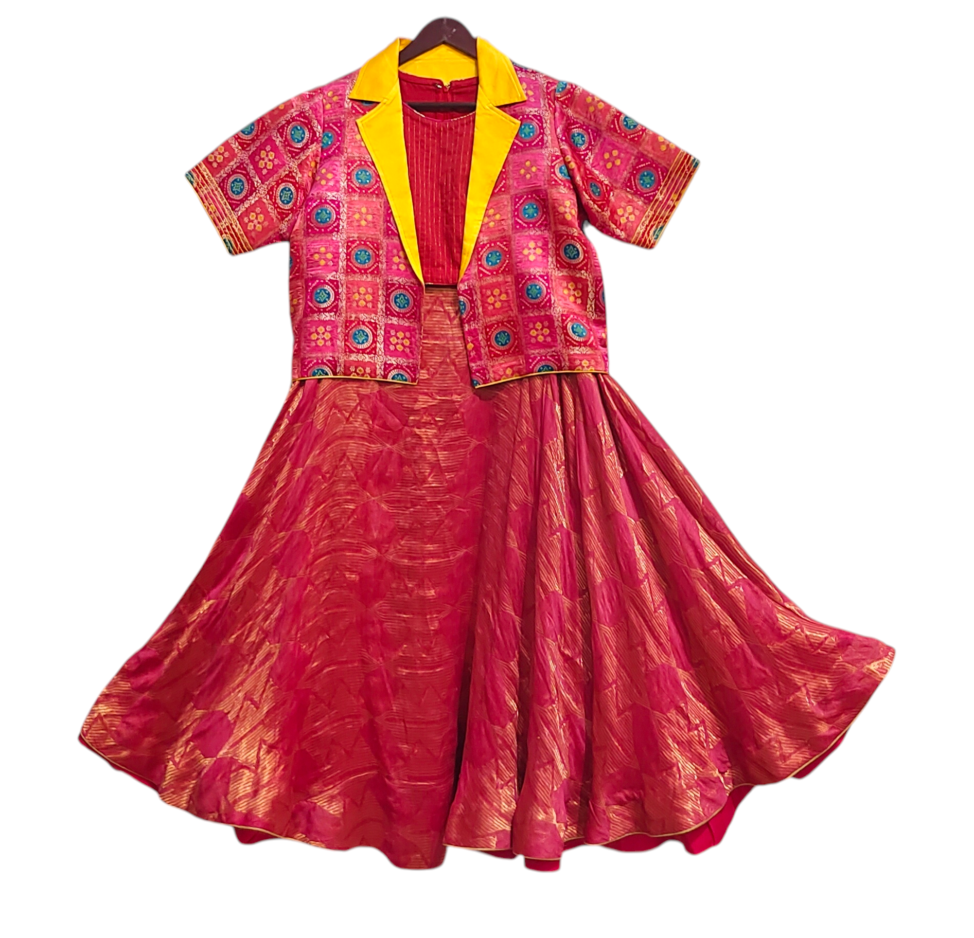 A sleeveless cropped red blouse with fine vertical pintucks, paired with a flowing full-length flared skirt in coral pinkish red and gold woven brocade, and layered with a short-sleeved cropped jacket in vibrant fuchsia pink with multicolor circular and floral embroidered motifs, finished with a striking mustard yellow wide lapel collar