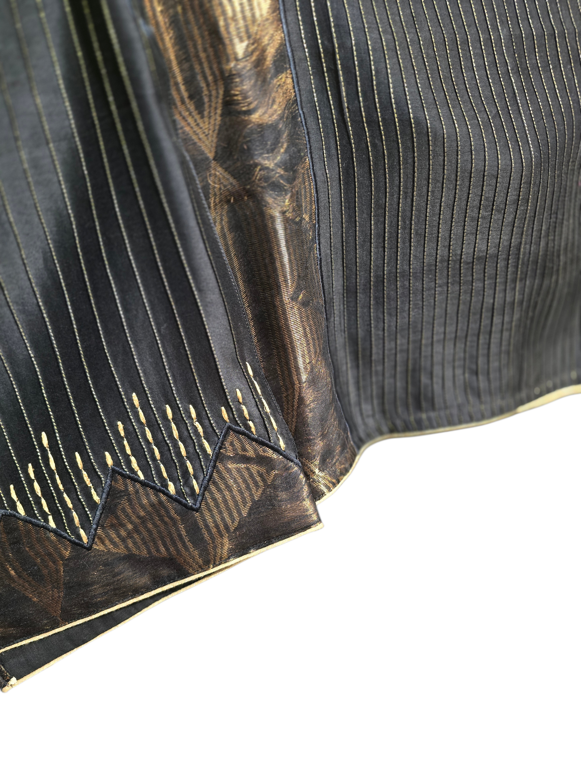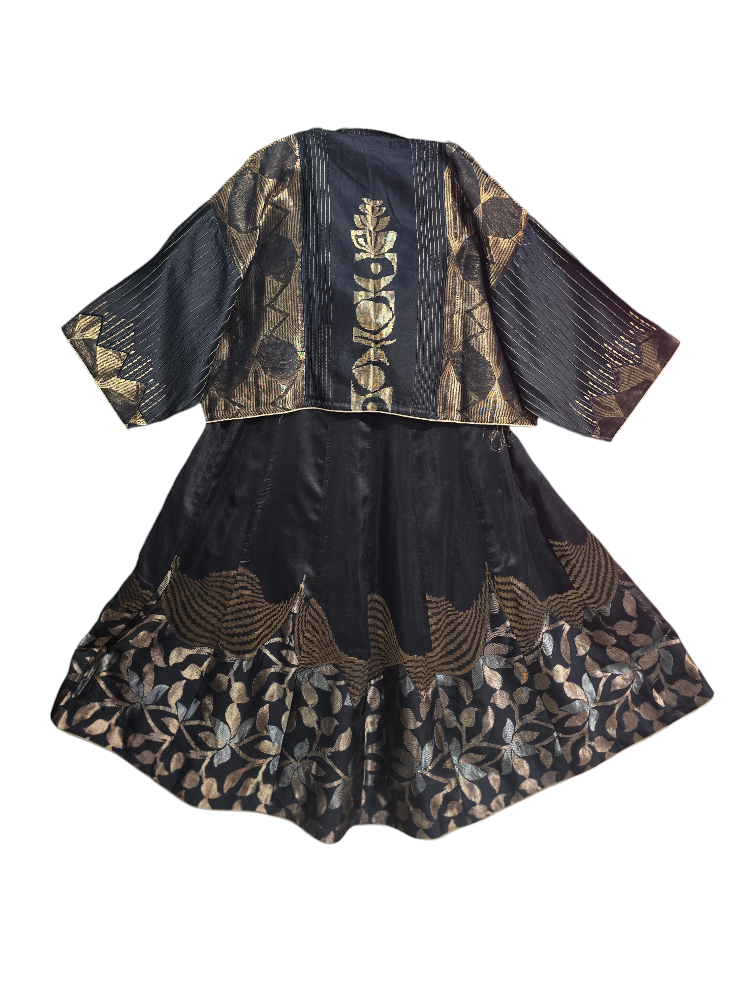 A black two-piece silk ensemble featuring a cropped boxy blouse with wide 3/4th sleeves, gold vertical pinstripes, and bold geometric and floral brocade detailing, paired with a matching high-waisted, ankle-length flared skirt adorned with textured wave motifs and a wide metallic floral border