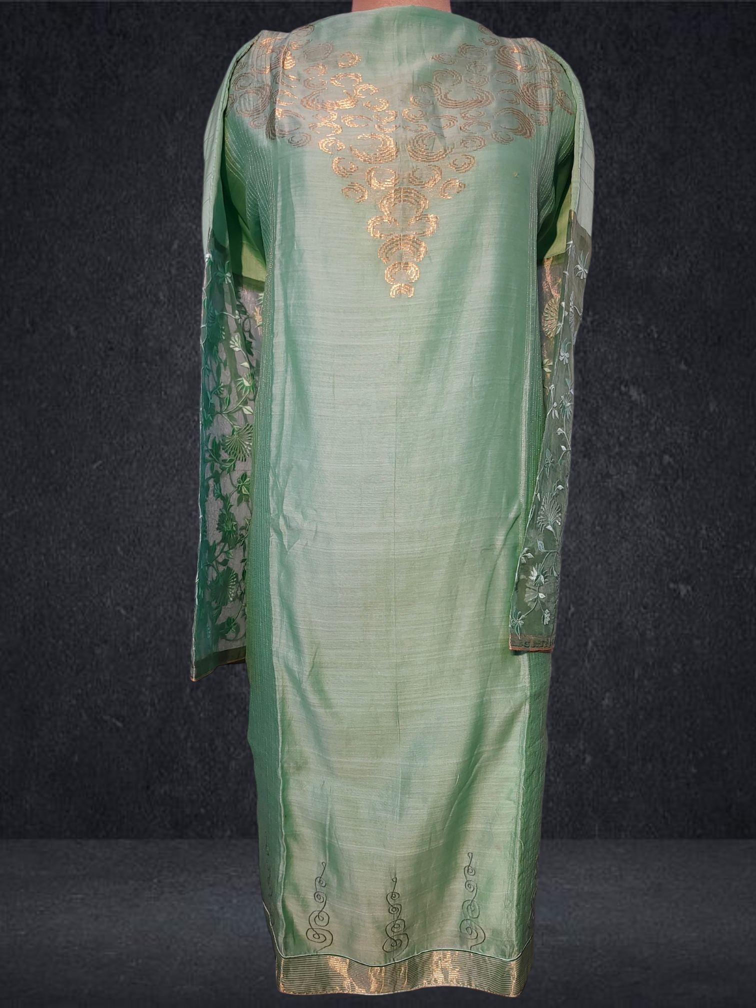 It is paired with a shaded Chanderi dupatta with floral motifs. The dupatta measures 2.5 meters in length and 38 inches in width.The ensemble is provided with a matching cotton satin bottom material for 2.5 mts.