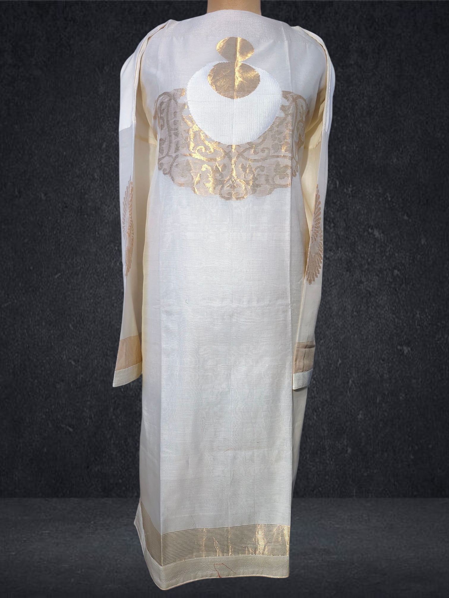 This 3 pc suitset features an elegant zari woven buta kurta and textured chanderi designed in unique abstract floral theme.Kurta is 48 inch maximum in length but can be shortened as per requirement as there is no neckline .The single side ghera is 34 inch so sizes upto 5XL are possible to get tailored in this material.The kurta is prelined with cotton mal.