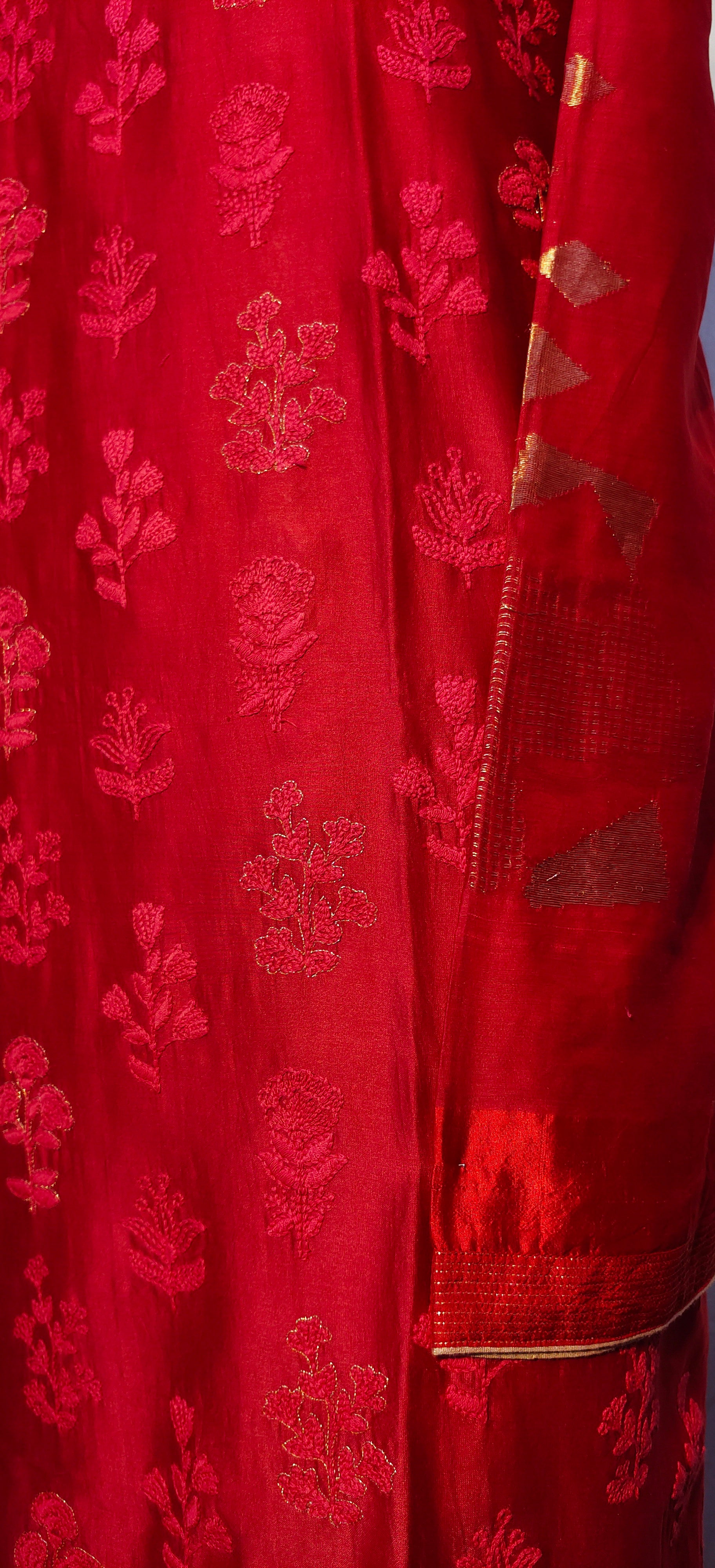It is paired with a shaded Chanderi dupatta with floral motifs. The dupatta measures 2.5 meters in length and 38 inches in width.The ensemble is provided with a matching cotton satin bottom material for 2.5 mts.