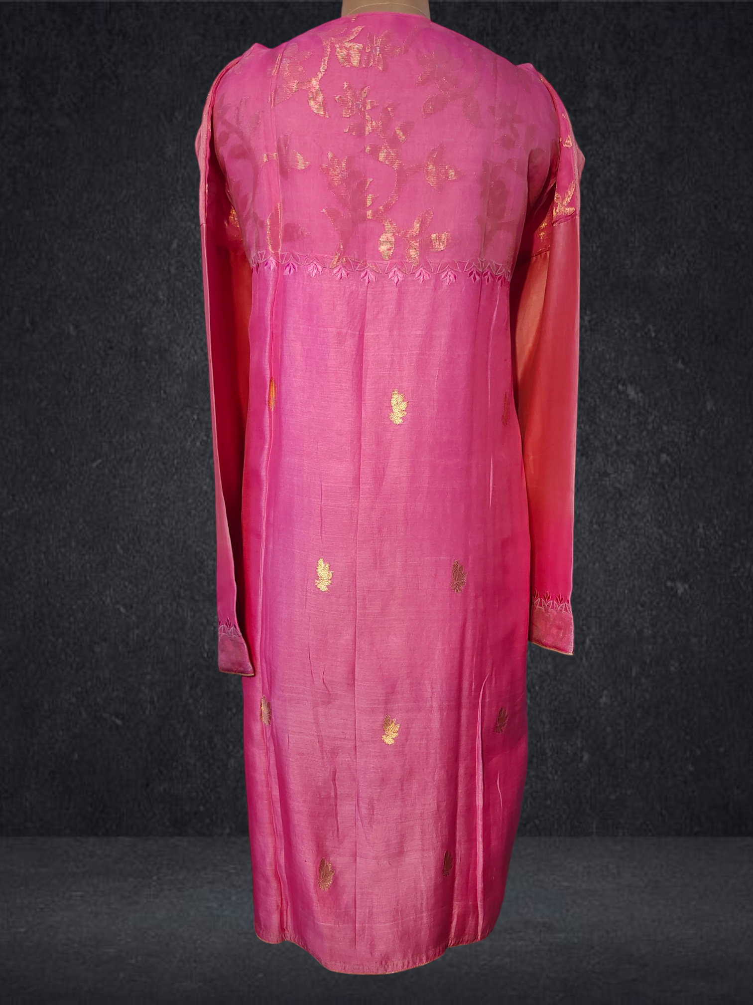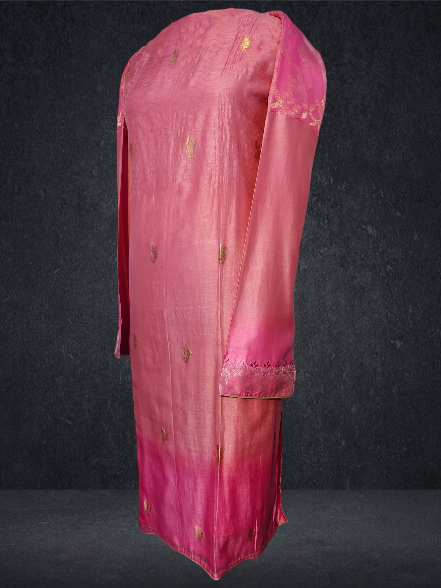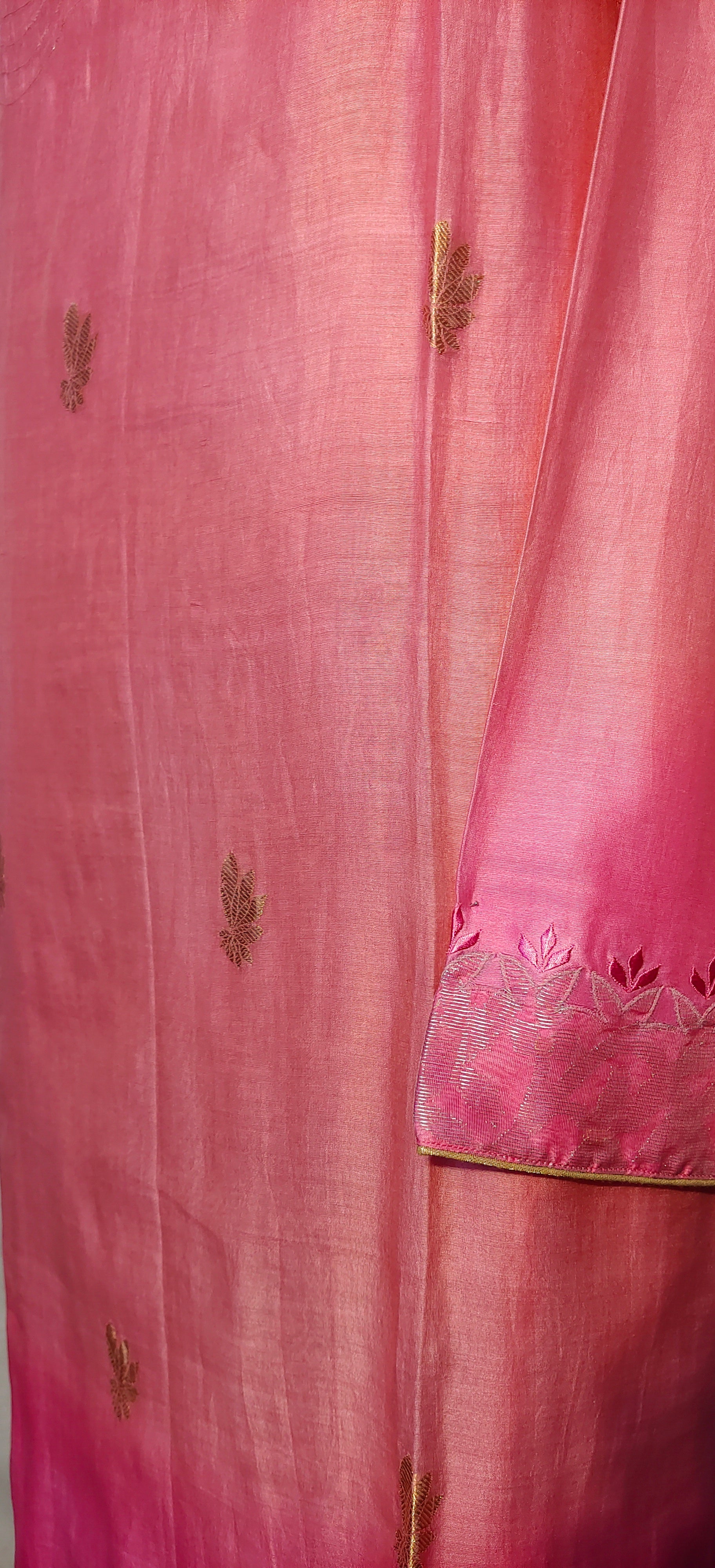 It is paired with a shaded Chanderi dupatta with floral motifs. The dupatta measures 2.5 meters in length and 38 inches in width.The ensemble is provided with a matching cotton satin bottom material for 2.5 mts.