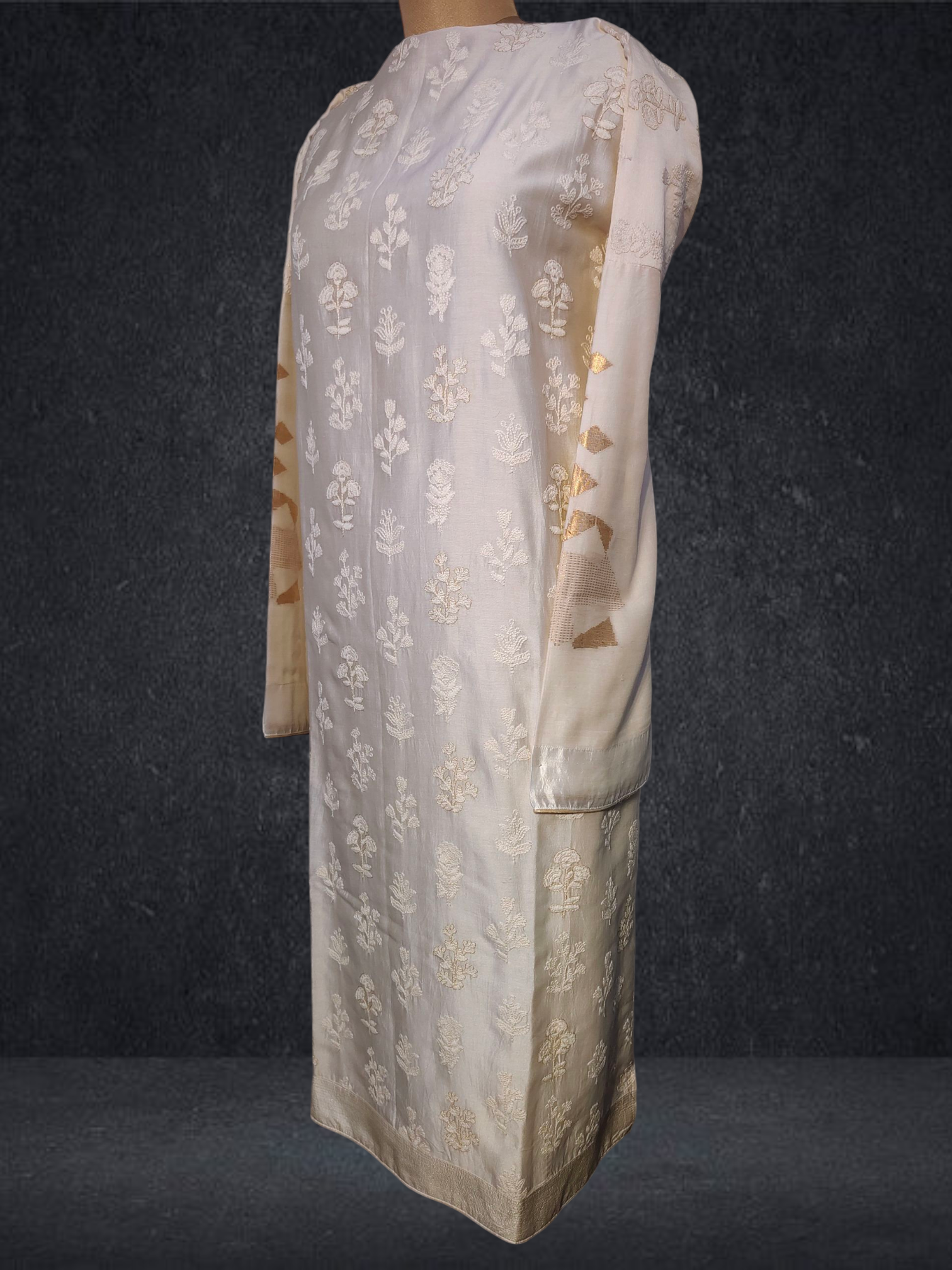 This 3 pc suitset features an elegant zari woven buta kurta and textured chanderi designed in unique abstract floral theme.Kurta is 48 inch maximum in length but can be shortened as per requirement as there is no neckline .The single side ghera is 34 inch so sizes upto 5XL are possible to get tailored in this material.The kurta is prelined with cotton mal.
