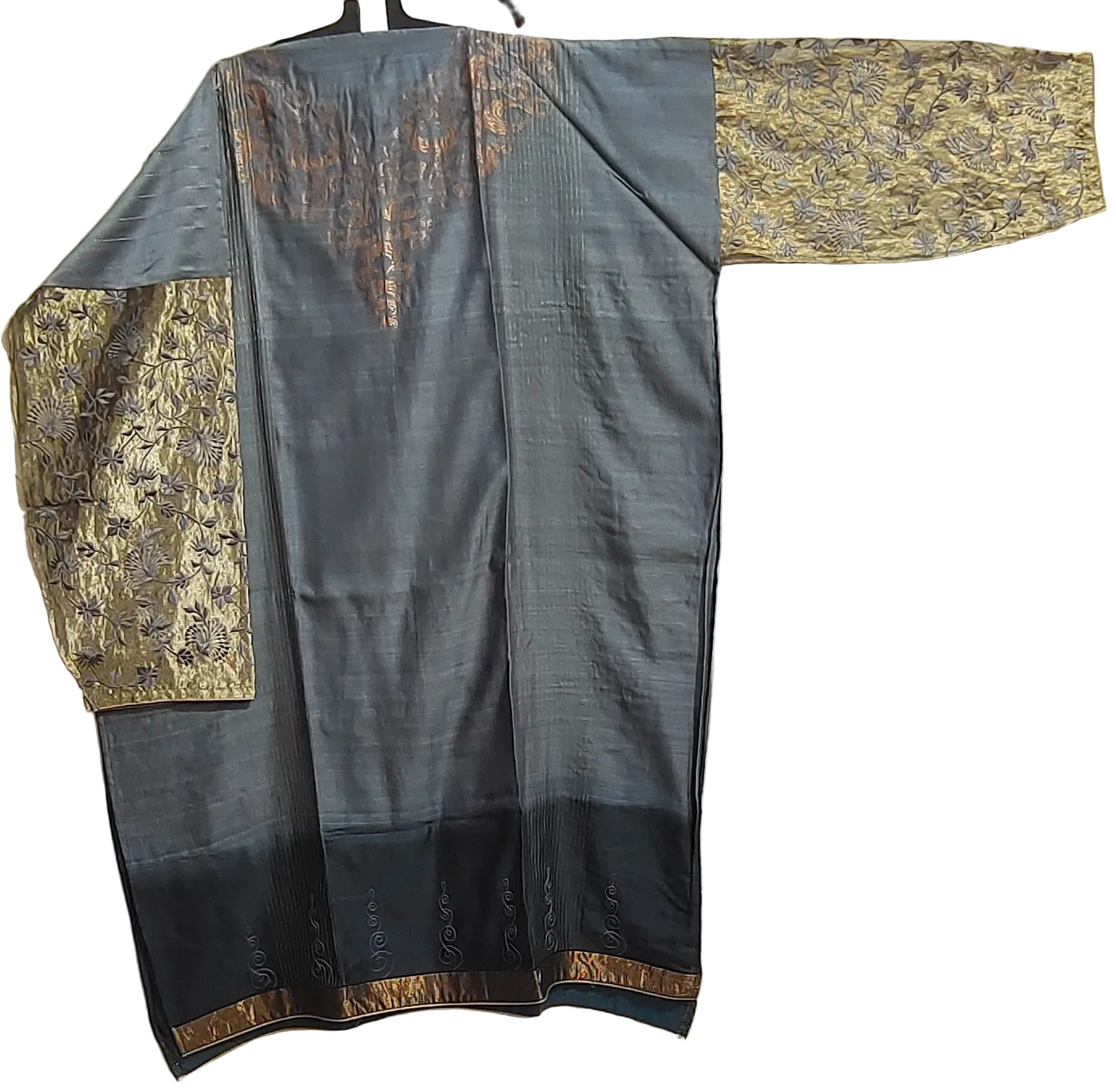 This is a knee-length 48 inch long dusky blue chanderi silk kurta with zaribwoven abstract floral motifsand silk tissue embroidered sleeves