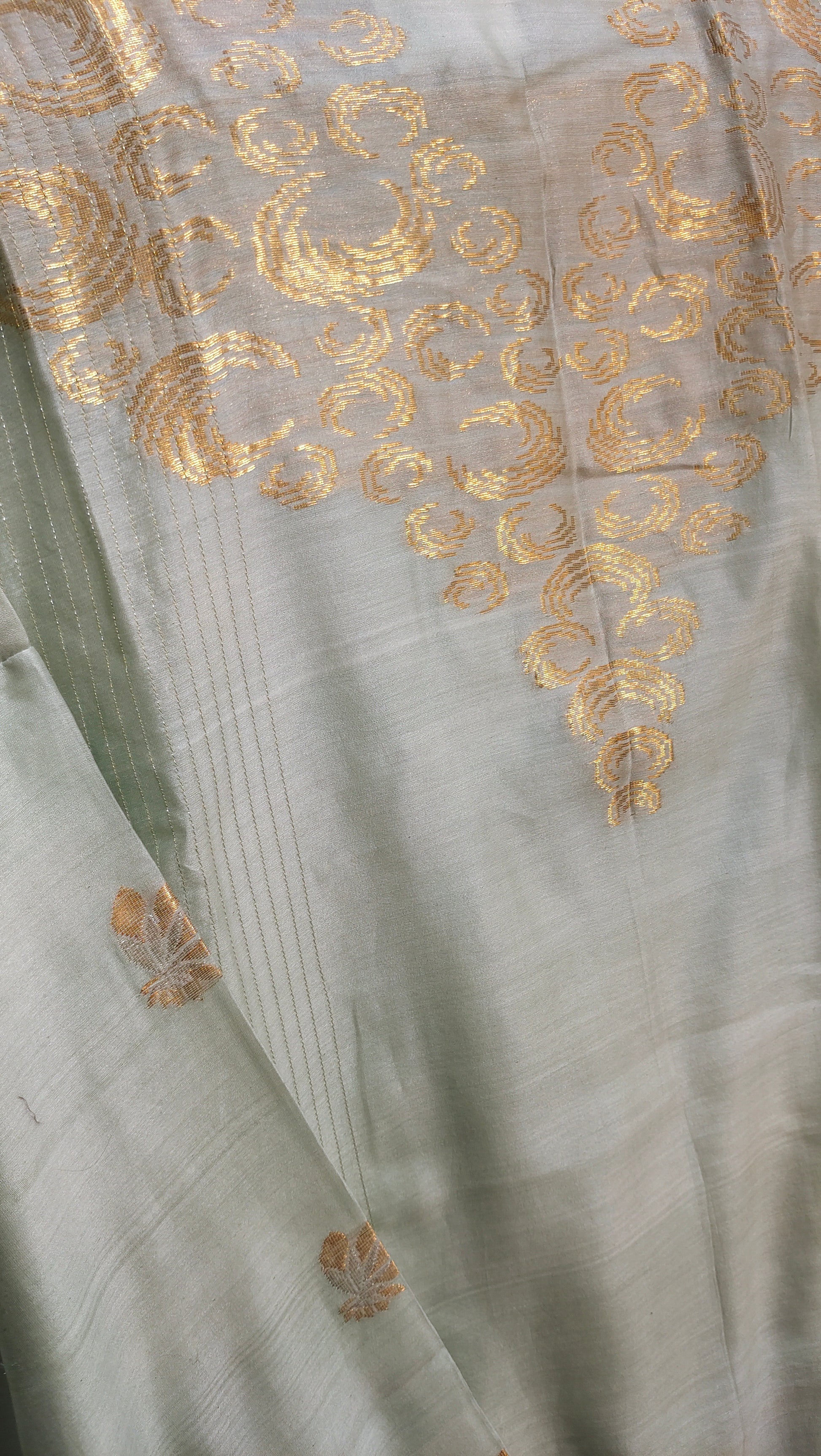 A soft pastel mint green silk kurta featuring light golden embroidery in a V-shaped neckline, small floral motifs on the sleeves, vertical pin-tuck detailing, and delicate floral embroidery along the back hem, finished with a muted gold border