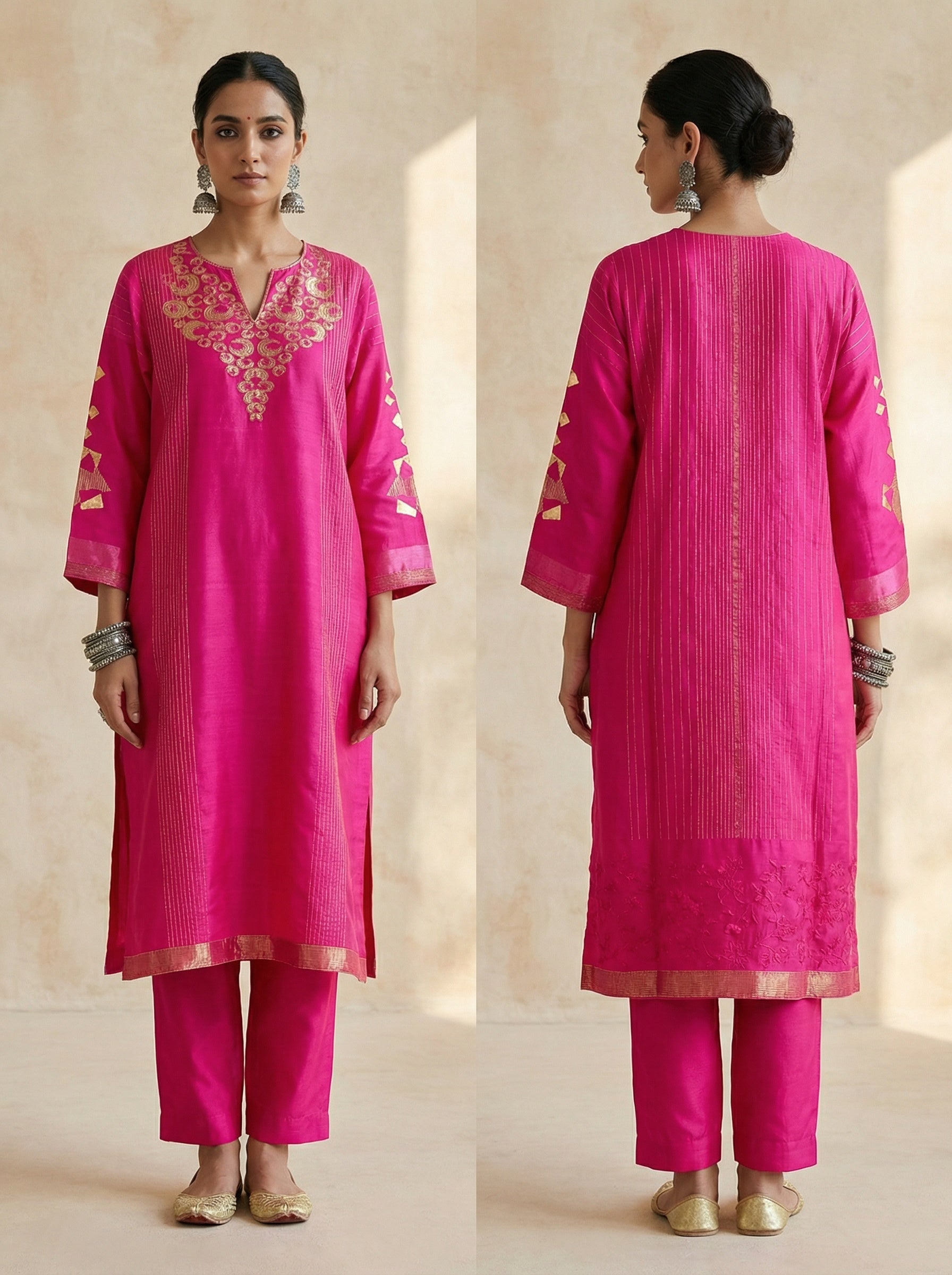 A hot pink silk kurta featuring ornate gold embroidery at the neckline, geometric gold foil details on the sleeves, vertical pin-tuck stitching, and a subtle floral embroidered hem, finished with a metallic gold border