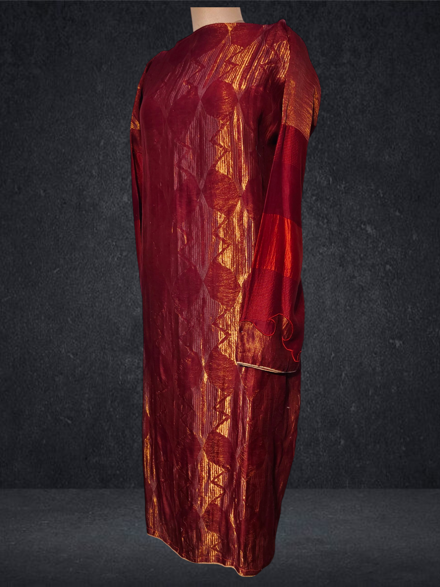 This 3 pc suitset features an elegant zari woven buta kurta and textured chanderi designed in unique abstract floral theme.Kurta is 48 inch maximum in length but can be shortened as per requirement as there is no neckline .The single side ghera is 34 inch so sizes upto 5XL are possible to get tailored in this material.The kurta is prelined with cotton mal.