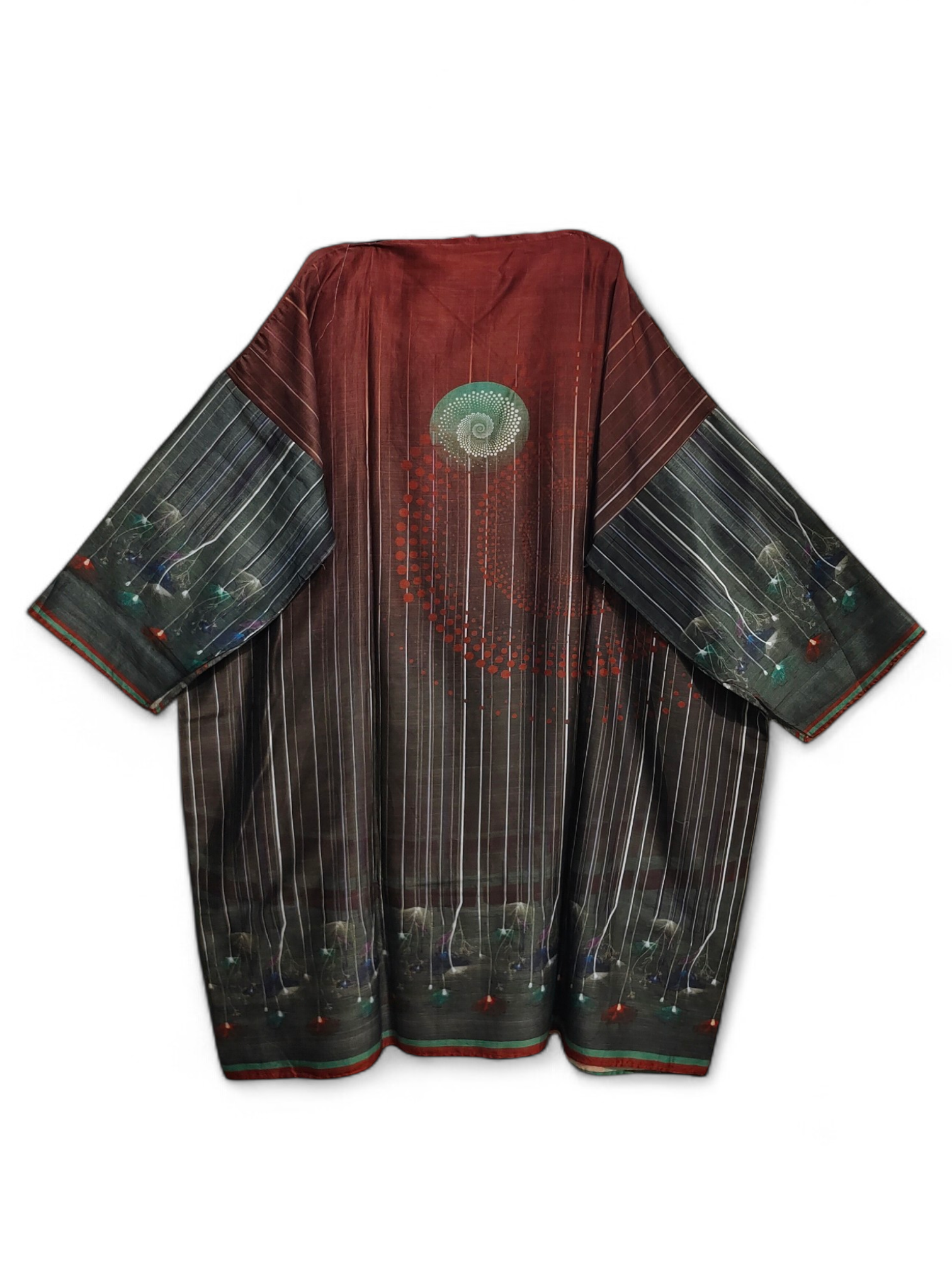 A mid calf-length, loose-fit silk kurta with a gradient base transitioning from deep maroon to forest green, featuring bold digital-inspired prints of red polka dots, white waves, and a spiral motif on the back, along with vertical stripe detailing and abstract floral sleeve accents,