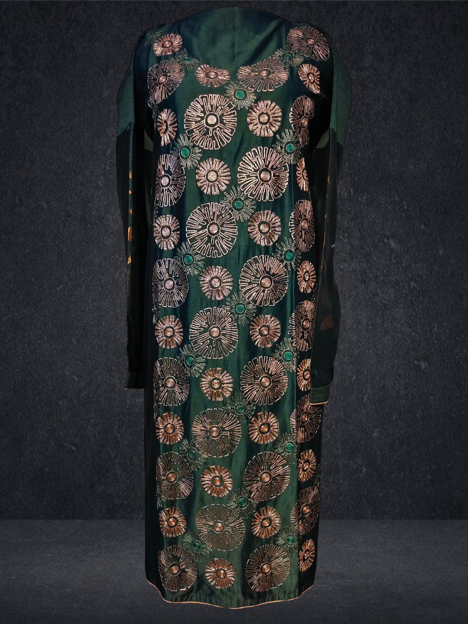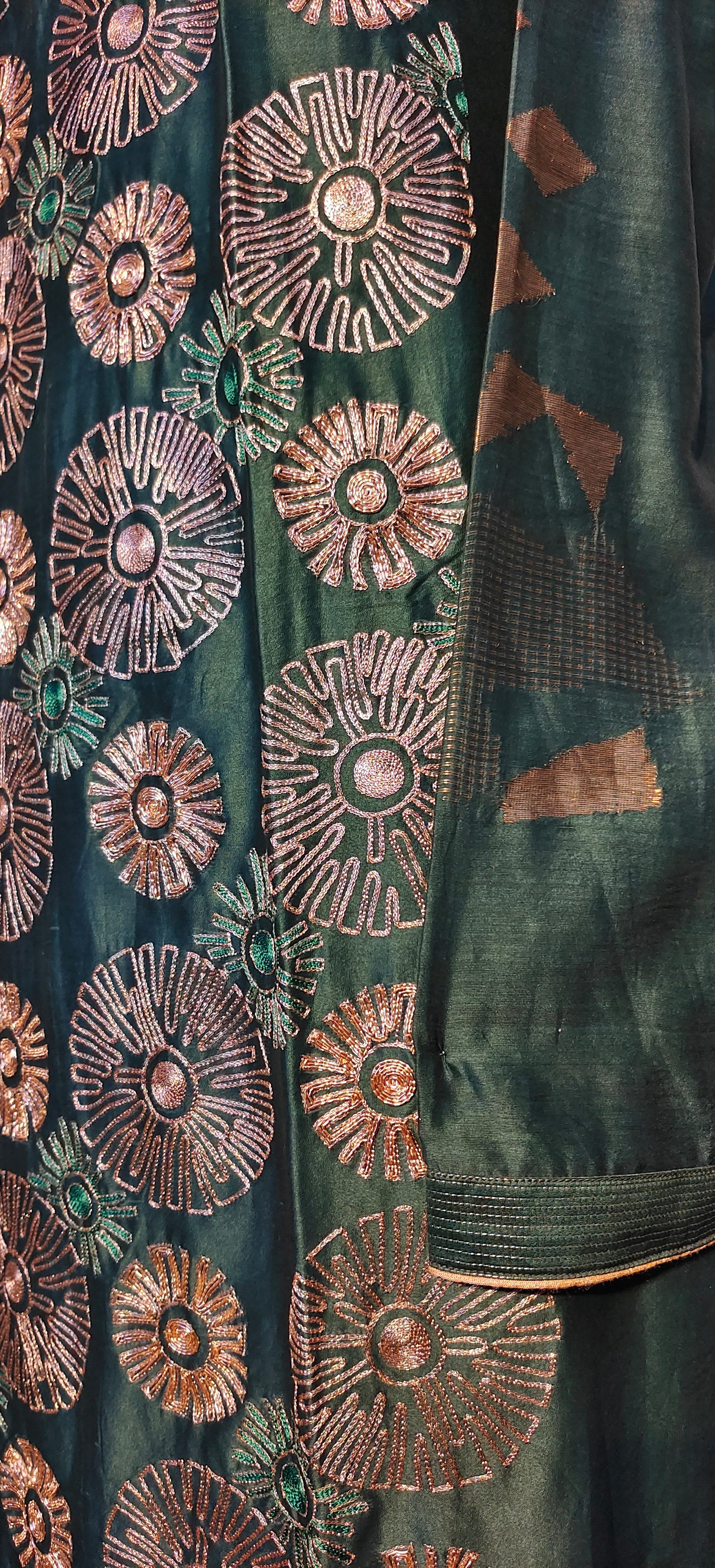 This 3 pc suitset features an elegant zari woven buta kurta and textured chanderi designed in unique abstract floral theme.Kurta is 48 inch maximum in length but can be shortened as per requirement as there is no neckline .The single side ghera is 34 inch so sizes upto 5XL are possible to get tailored in this material.The kurta is prelined with cotton mal.