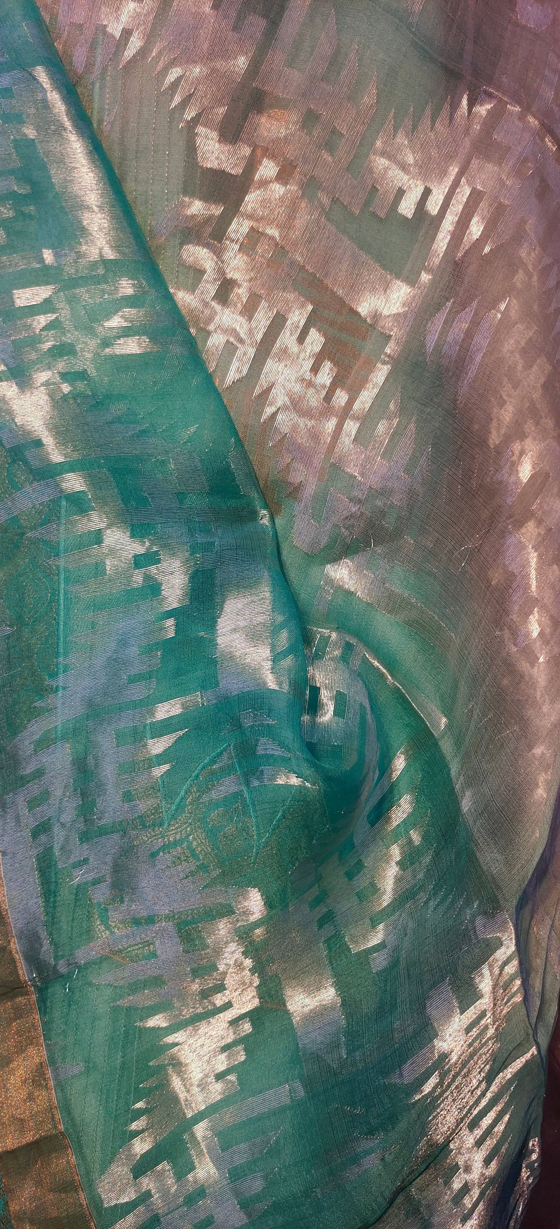 This 3 pc suitset features an elegant zari woven buta kurta and textured chanderi designed in unique abstract floral theme.Kurta is 48 inch maximum in length but can be shortened as per requirement as there is no neckline .The single side ghera is 34 inch so sizes upto 5XL are possible to get tailored in this material.The kurta is prelined with cotton mal.