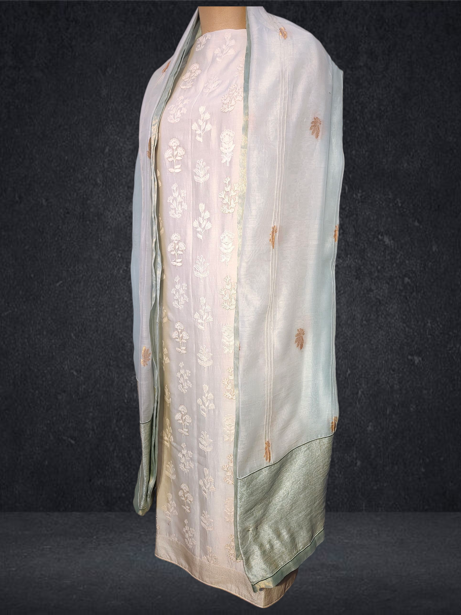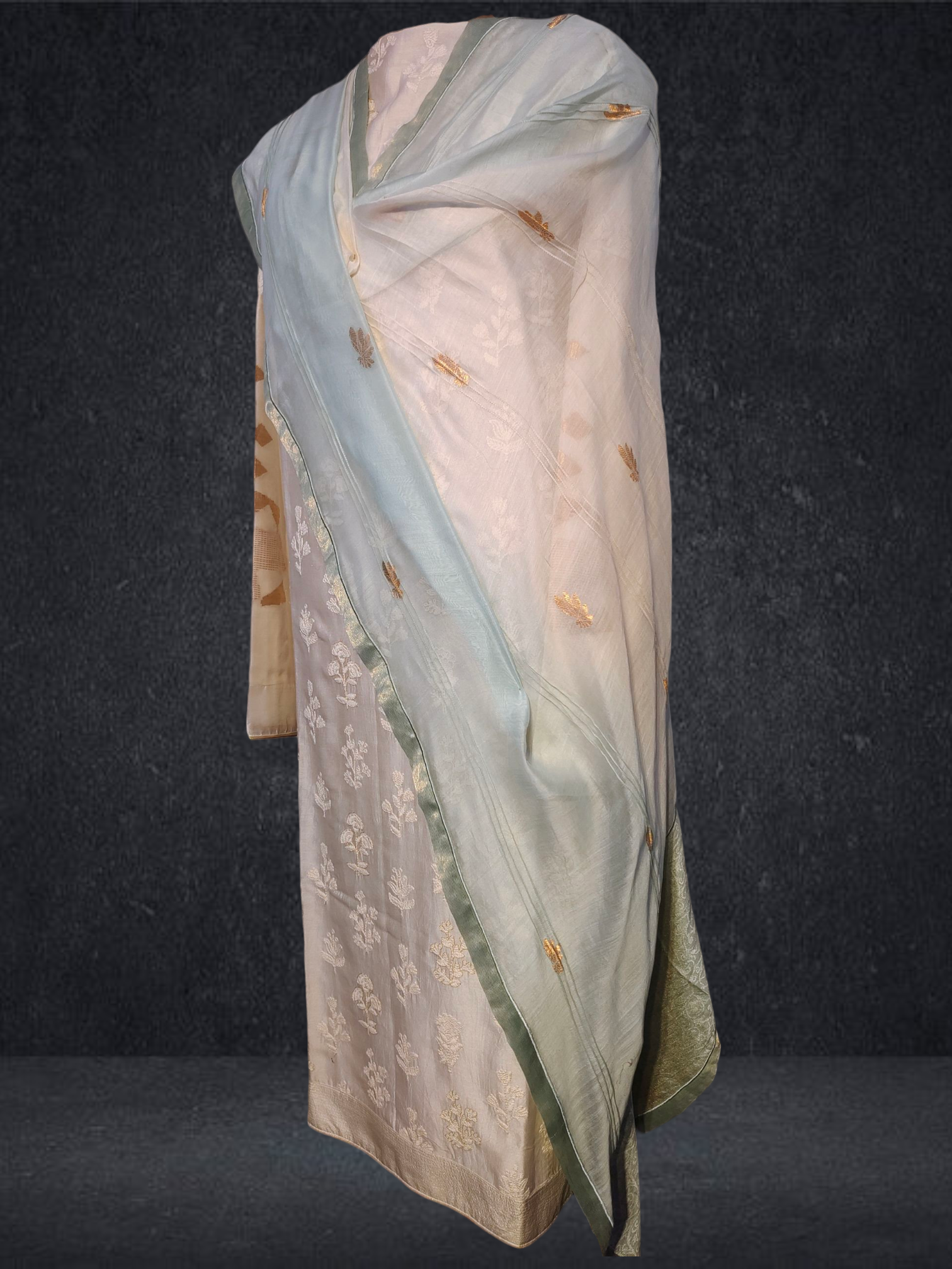 This 3 pc suitset features an elegant zari woven buta kurta and textured chanderi designed in unique abstract floral theme.Kurta is 48 inch maximum in length but can be shortened as per requirement as there is no neckline .The single side ghera is 34 inch so sizes upto 5XL are possible to get tailored in this material.The kurta is prelined with cotton mal.