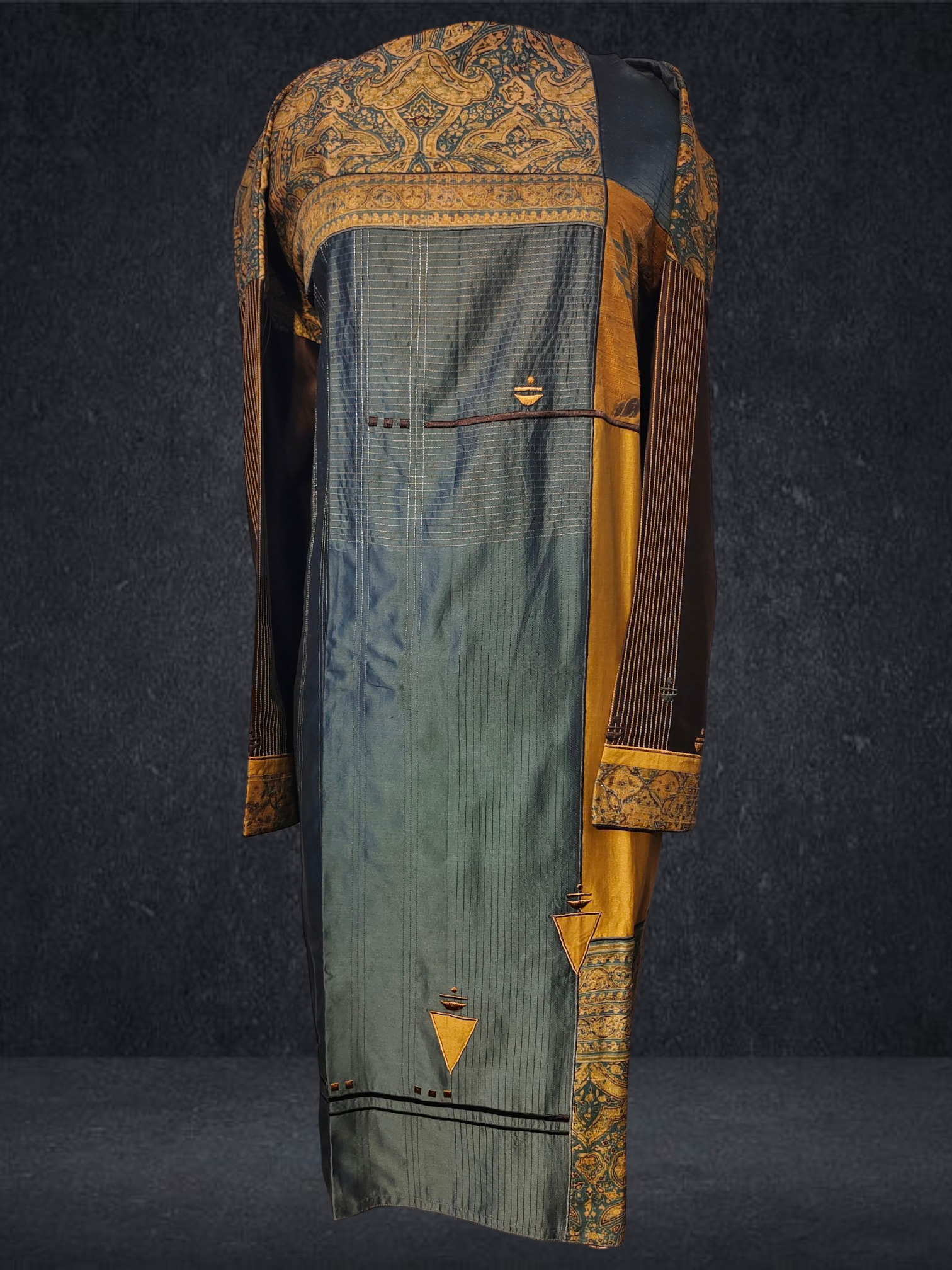 This 3 pc suitset features an elegant zari woven buta kurta and textured chanderi designed in unique abstract floral theme.Kurta is 48 inch maximum in length but can be shortened as per requirement as there is no neckline .The single side ghera is 34 inch so sizes upto 5XL are possible to get tailored in this material.The kurta is prelined with cotton mal.