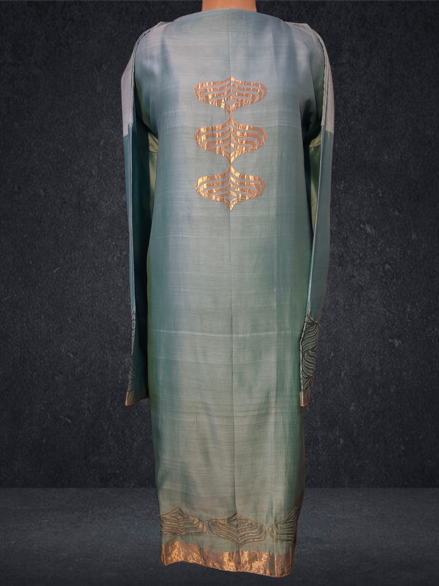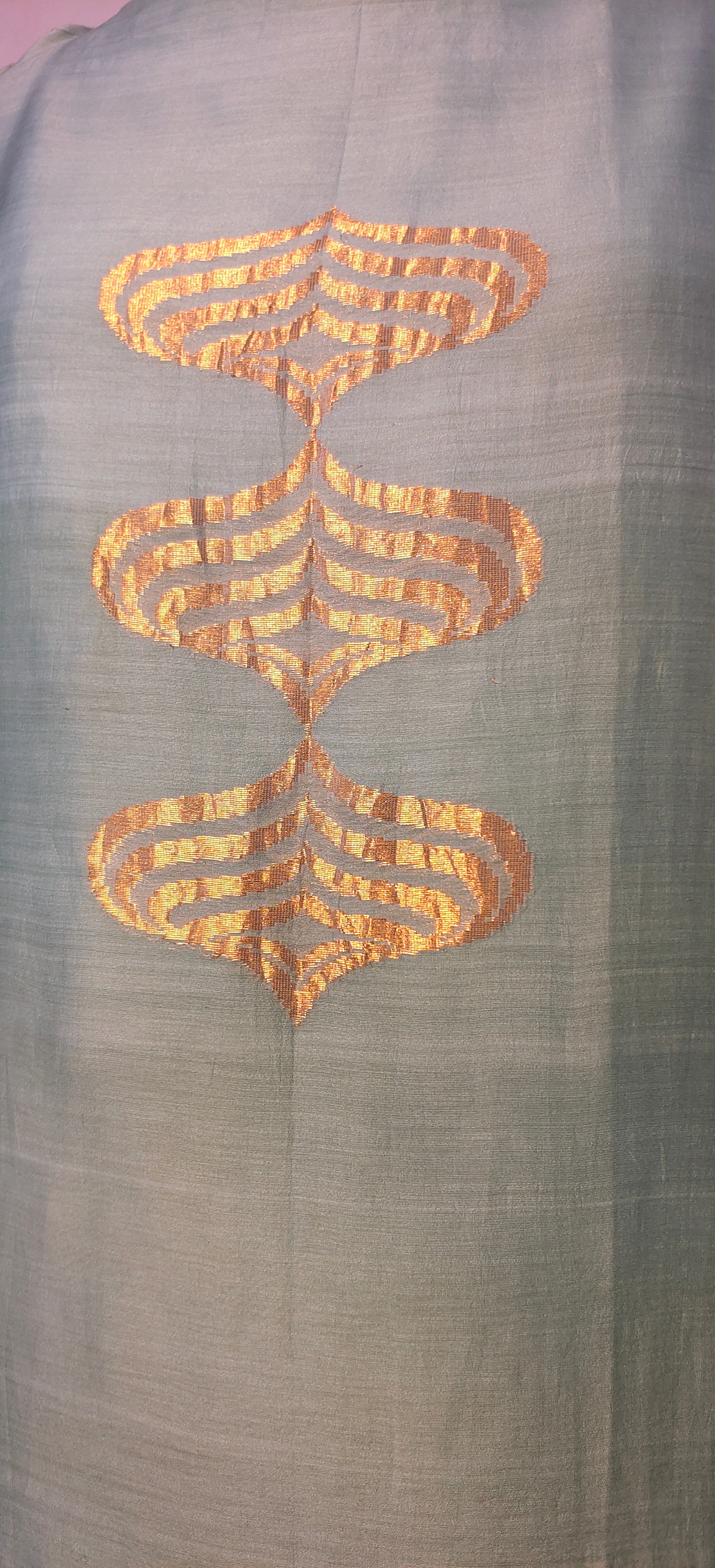 This 3 pc suitset features an elegant zari woven buta kurta and textured chanderi designed in unique abstract floral theme.Kurta is 48 inch maximum in length but can be shortened as per requirement as there is no neckline .The single side ghera is 34 inch so sizes upto 5XL are possible to get tailored in this material.The kurta is prelined with cotton mal.