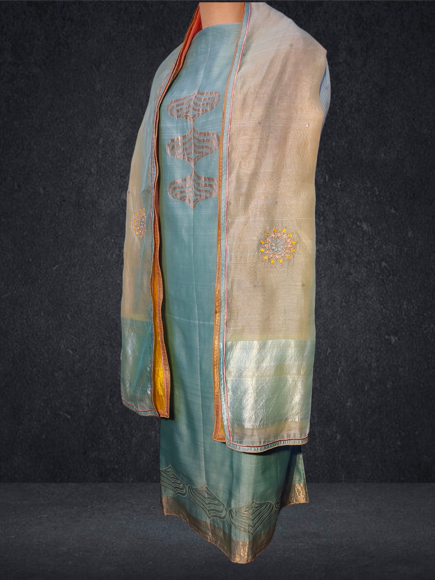 It is paired with a shaded Chanderi dupatta with floral motifs. The dupatta measures 2.5 meters in length and 38 inches in width.The ensemble is provided with a matching cotton satin bottom material for 2.5 mts.