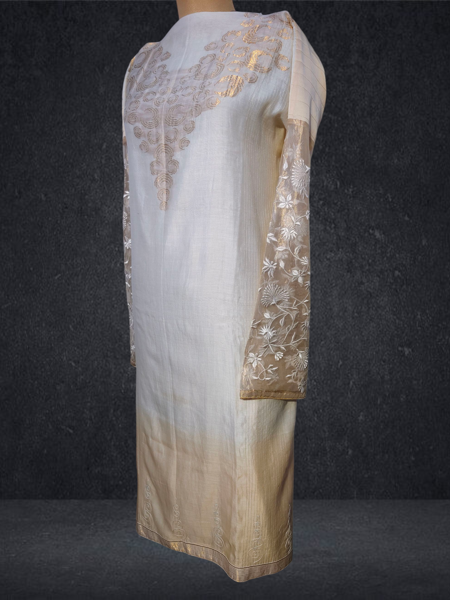It is paired with a shaded Chanderi dupatta with floral motifs. The dupatta measures 2.5 meters in length and 38 inches in width.The ensemble is provided with a matching cotton satin bottom material for 2.5 mts.