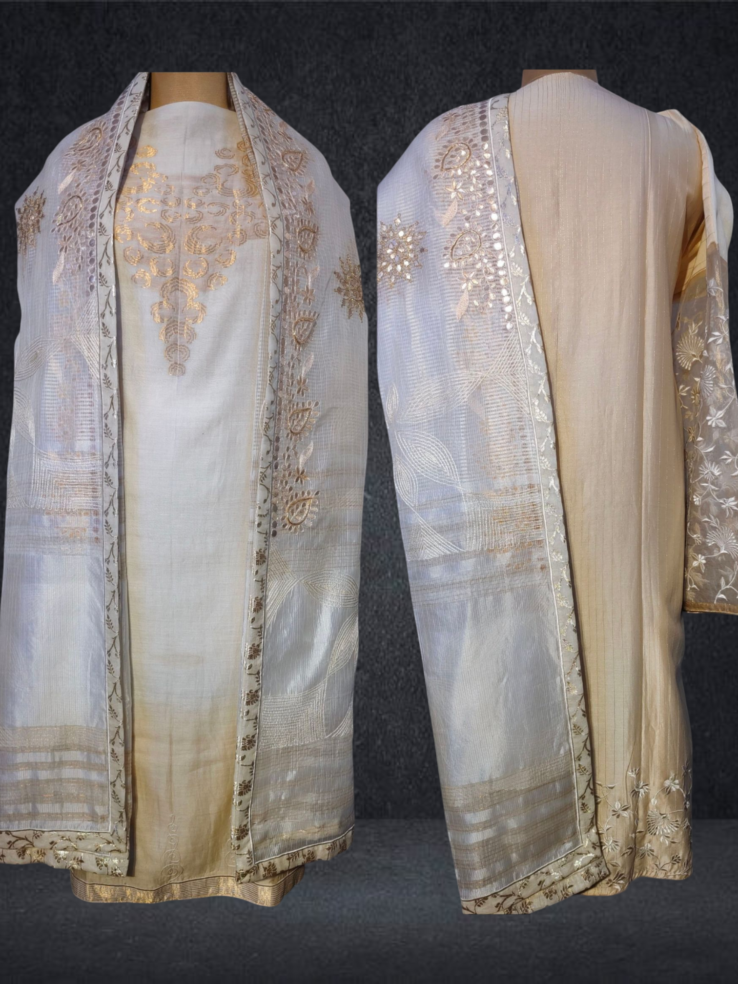 This 3 pc suitset features an elegant zari woven buta kurta and textured chanderi designed in unique abstract floral theme.Kurta is 48 inch maximum in length but can be shortened as per requirement as there is no neckline .The single side ghera is 34 inch so sizes upto 5XL are possible to get tailored in this material.The kurta is prelined with cotton mal.
