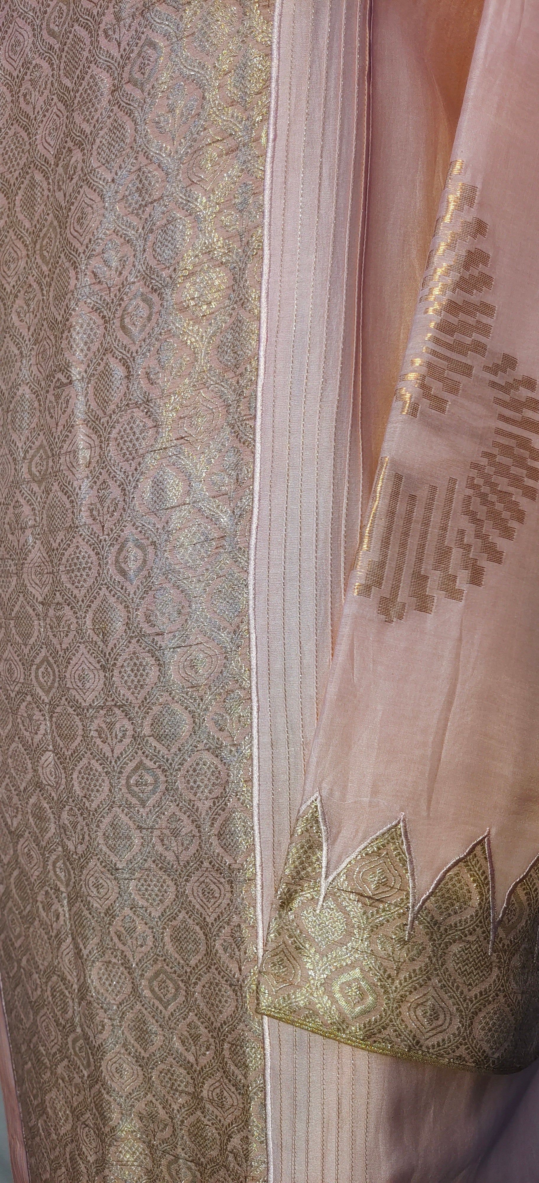 This 3 pc suitset features an elegant zari woven buta kurta and textured chanderi designed in unique abstract floral theme.Kurta is 48 inch maximum in length but can be shortened as per requirement as there is no neckline .The single side ghera is 34 inch so sizes upto 5XL are possible to get tailored in this material.The kurta is prelined with cotton mal.