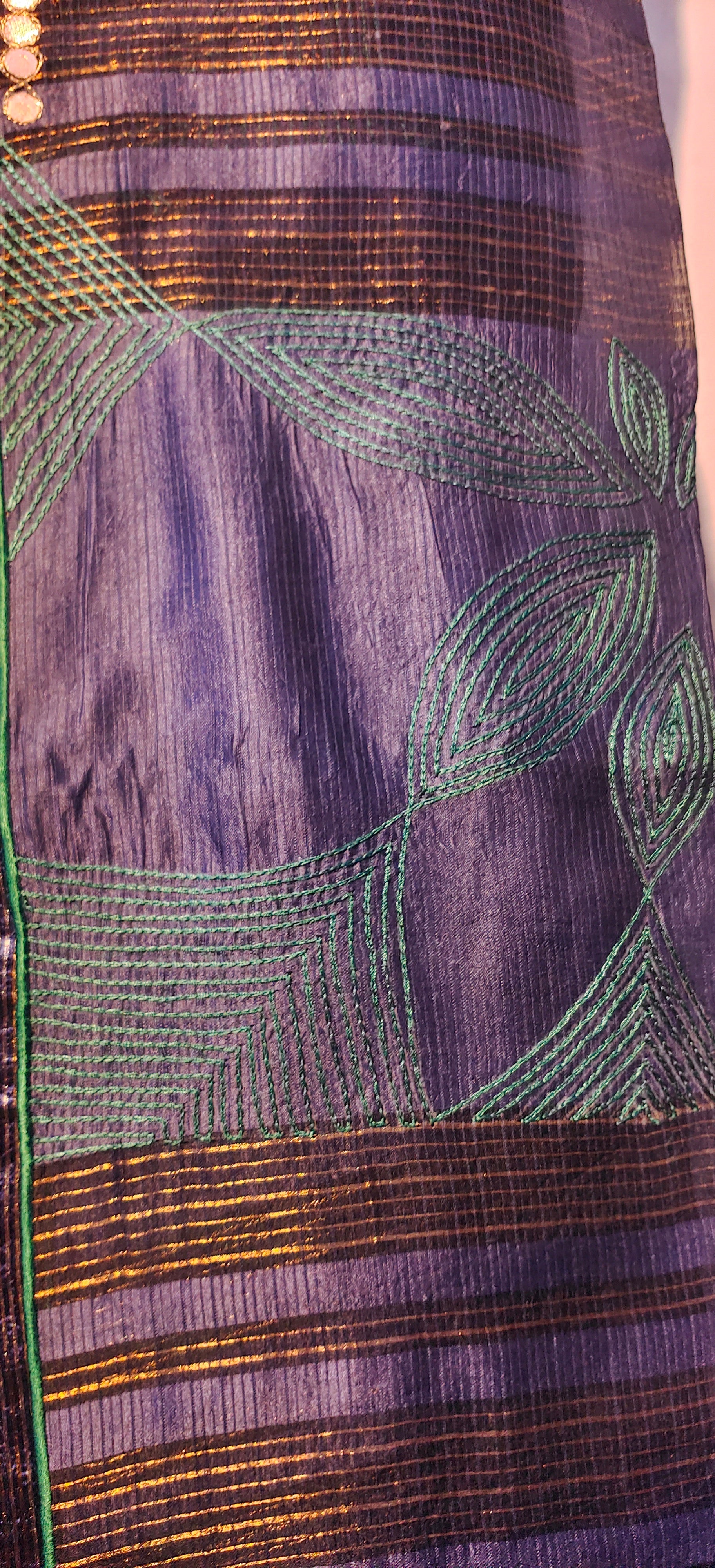 This 3 pc suitset features an elegant zari woven buta kurta and textured chanderi designed in unique abstract floral theme.Kurta is 48 inch maximum in length but can be shortened as per requirement as there is no neckline .The single side ghera is 34 inch so sizes upto 5XL are possible to get tailored in this material.The kurta is prelined with cotton mal.