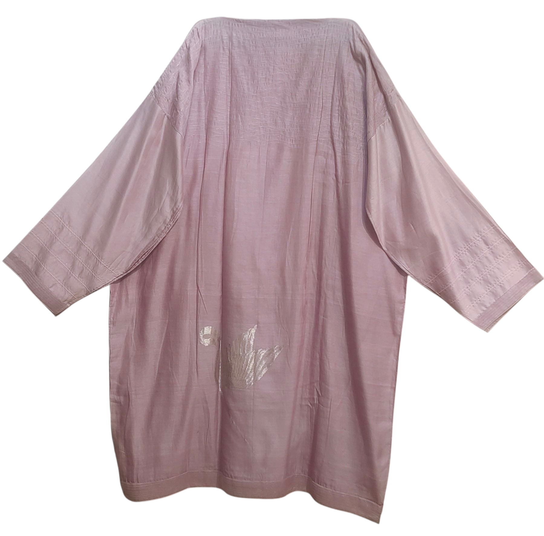 This semistitched 3 pc set features a mid calf-length pastel lavender silk kurta with silver woven vertical stripe motifs and soft tonal embroidery, paired with a sheer matching dupatta featuring delicate silver appliqué detailing and jacquard border accents, styled in a soft,worn with matching solid colour satin trouser pants, silver oxidised jewellery in earrings and bangles, golden matching heel sandles